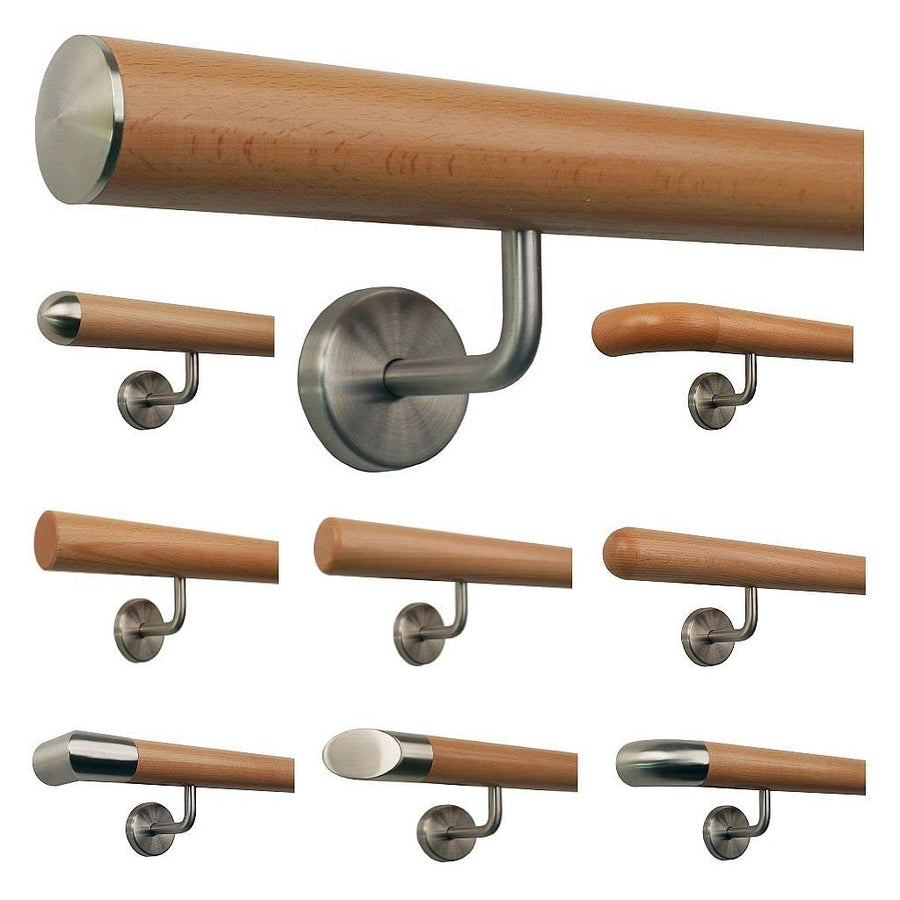 - Handlauf Buche 90 cm Länge mit 2 Haltern und Endstück: leicht gewölbte Edelstahlkappe