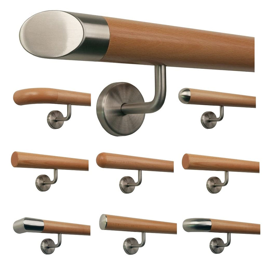 - Handlauf Buche 190 cm Länge mit 3 Haltern und Endstück: schräges Edelstahlendstück