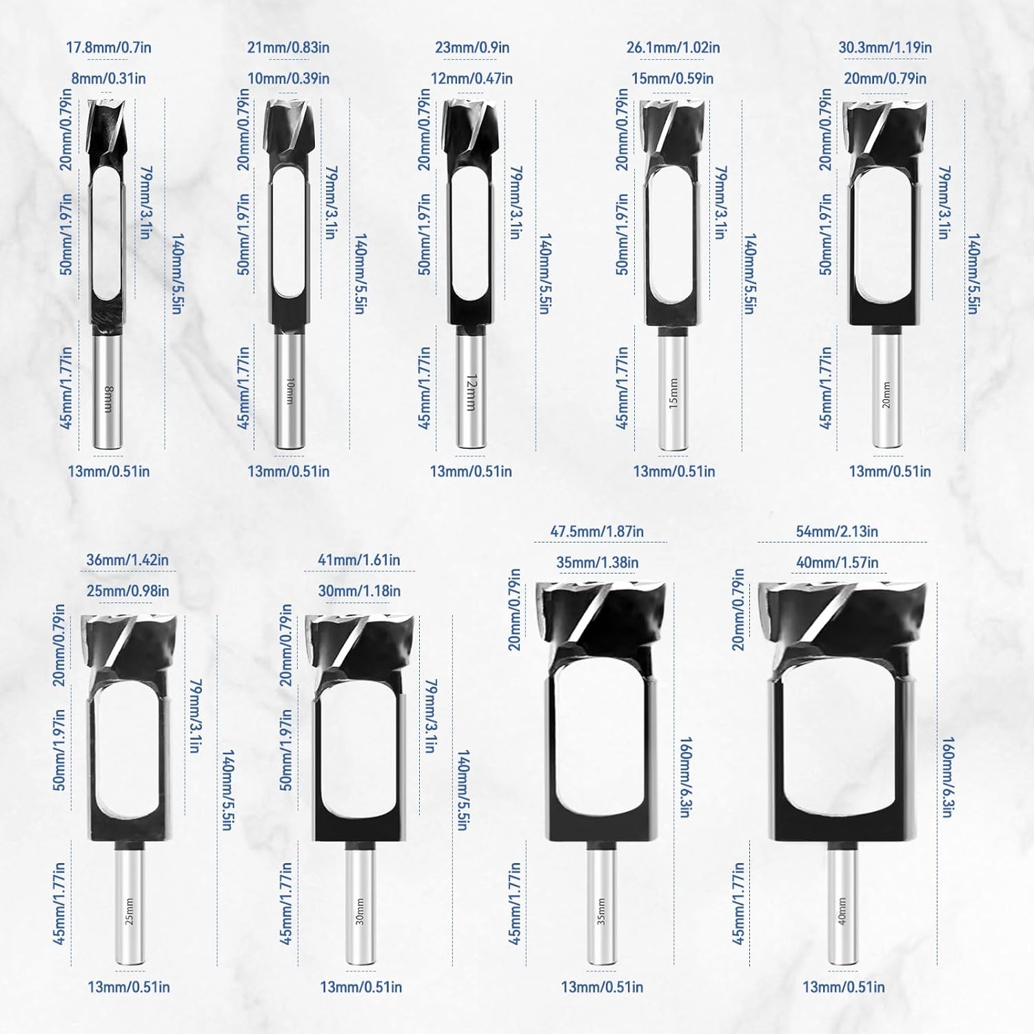 - 9 Grössen verfügbar: 8 mm, 10 mm, 12 mm, 15 mm, 20 mm, 25 mm, 30 mm, 35 mm, 40 mm zur Auswahl. Der Lochdurchmesser reicht von 8 mm bis 40 mm, der YWNYT-Holzdübelschneider erfüllt alle Ihre Holzbearbeitungsanforderungen