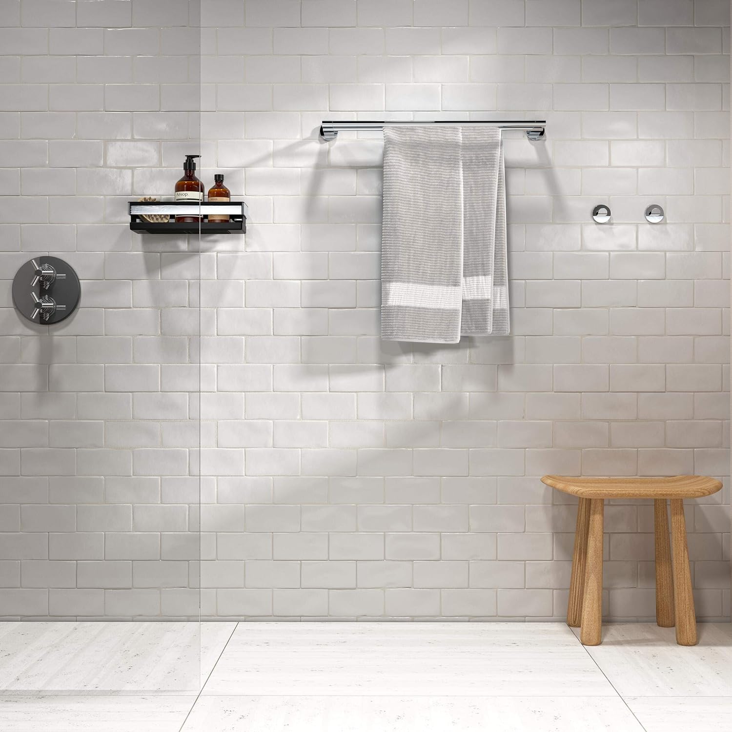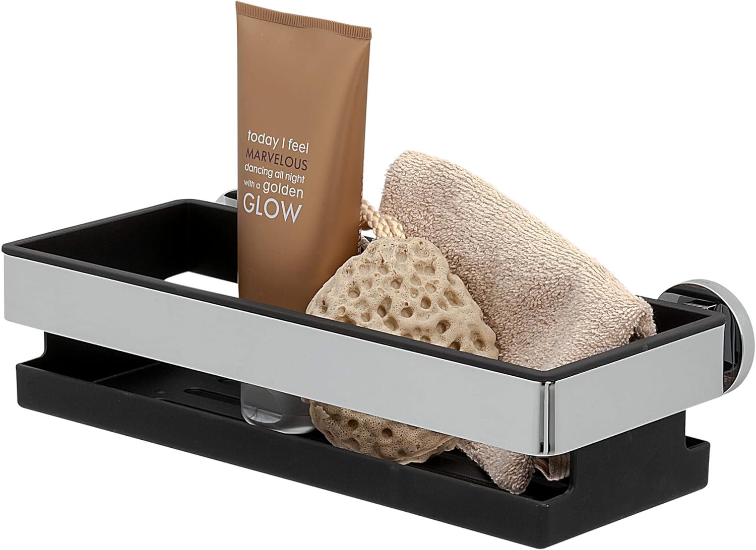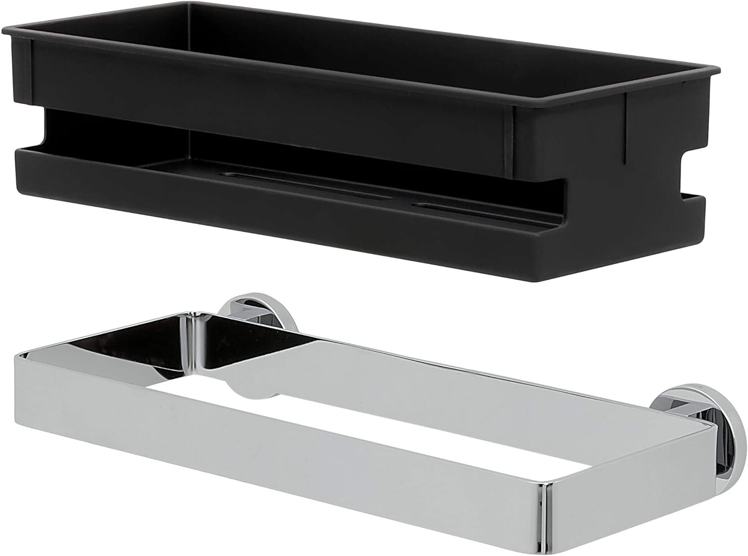 - Formschöne Duschablage aus hochwertigem Edelstahl in der Oberfläche verchromt mit herausnehmbaren Einsatz aus hochwertigem, matt-schwarzem Kunststoff