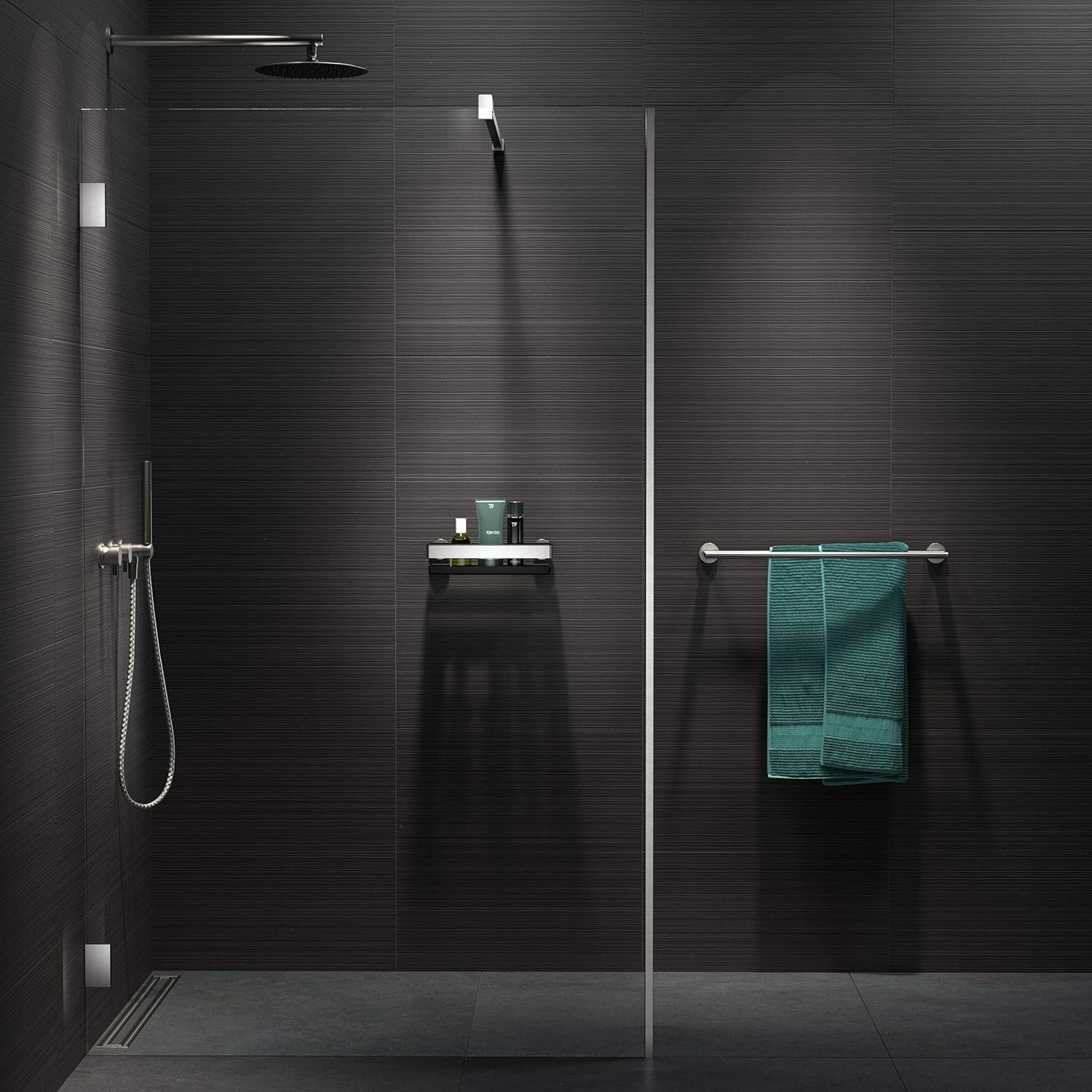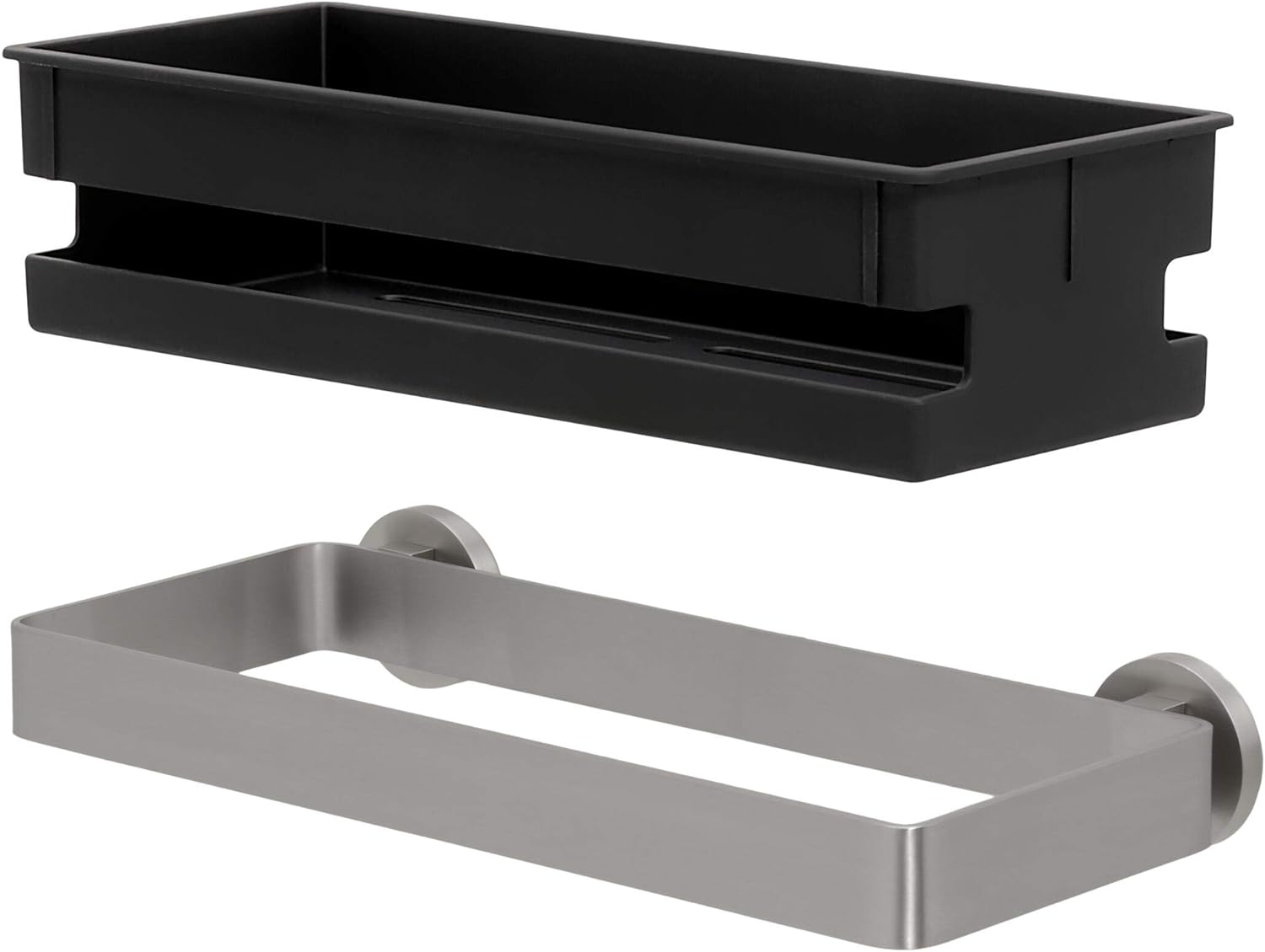 - Formschöne Duschablage aus hochwertigem Edelstahl in der Oberfläche gebürstet mit herausnehmbaren Einsatz aus hochwertigem, matt-schwarzem Kunststoff