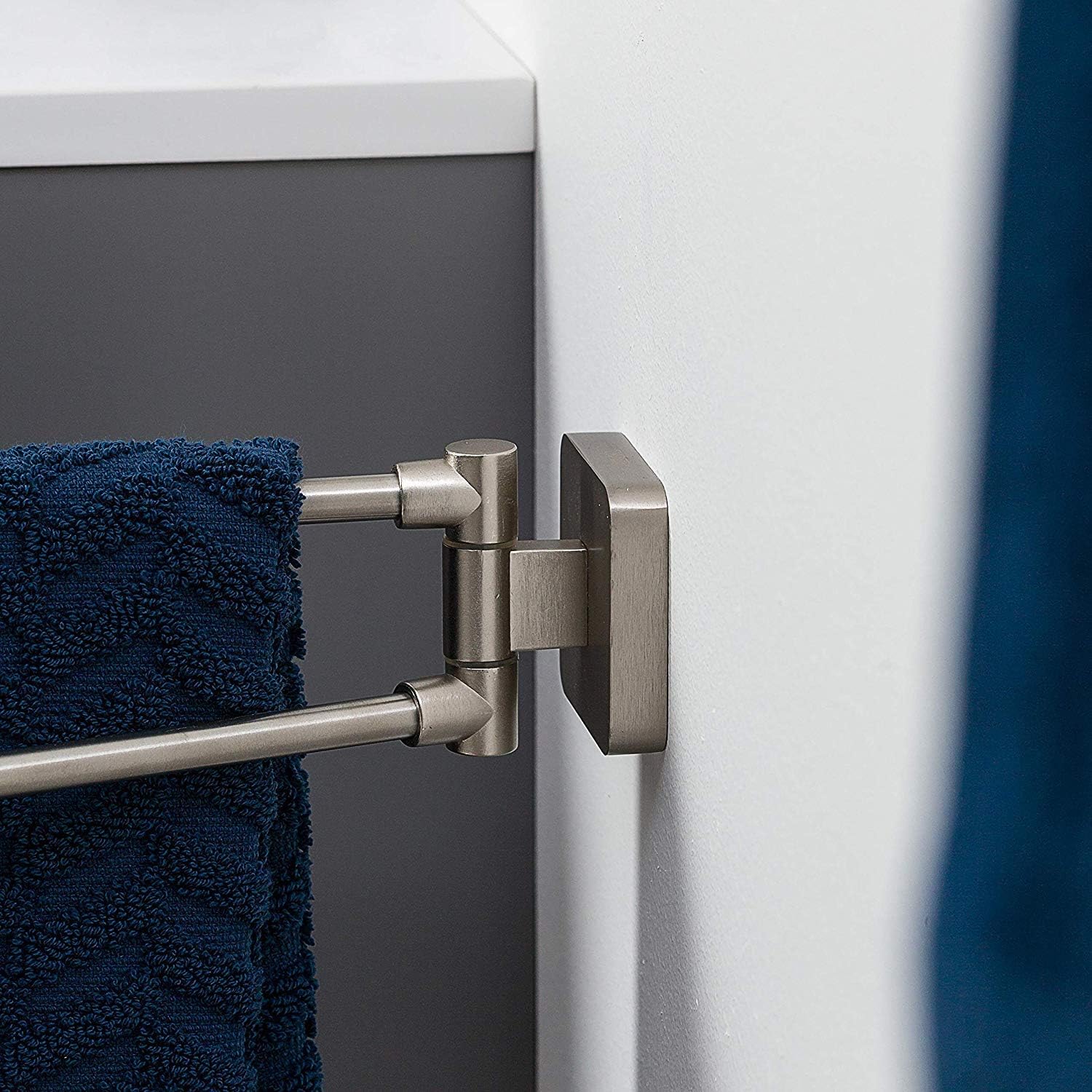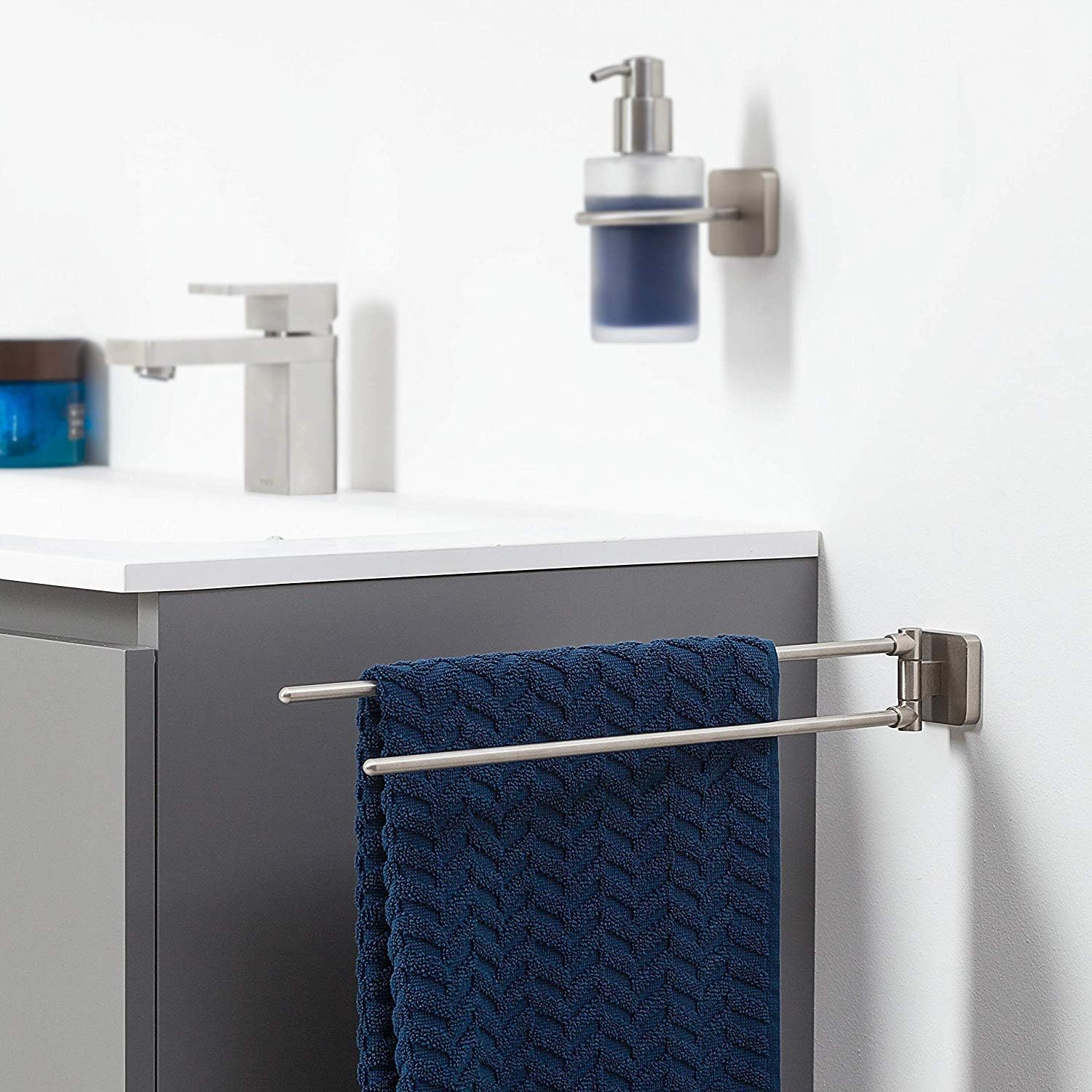 - Der Handtuchhalter hat zwei Schwenkarme, sodass Handtücher immer in greifbarer Nähe sind