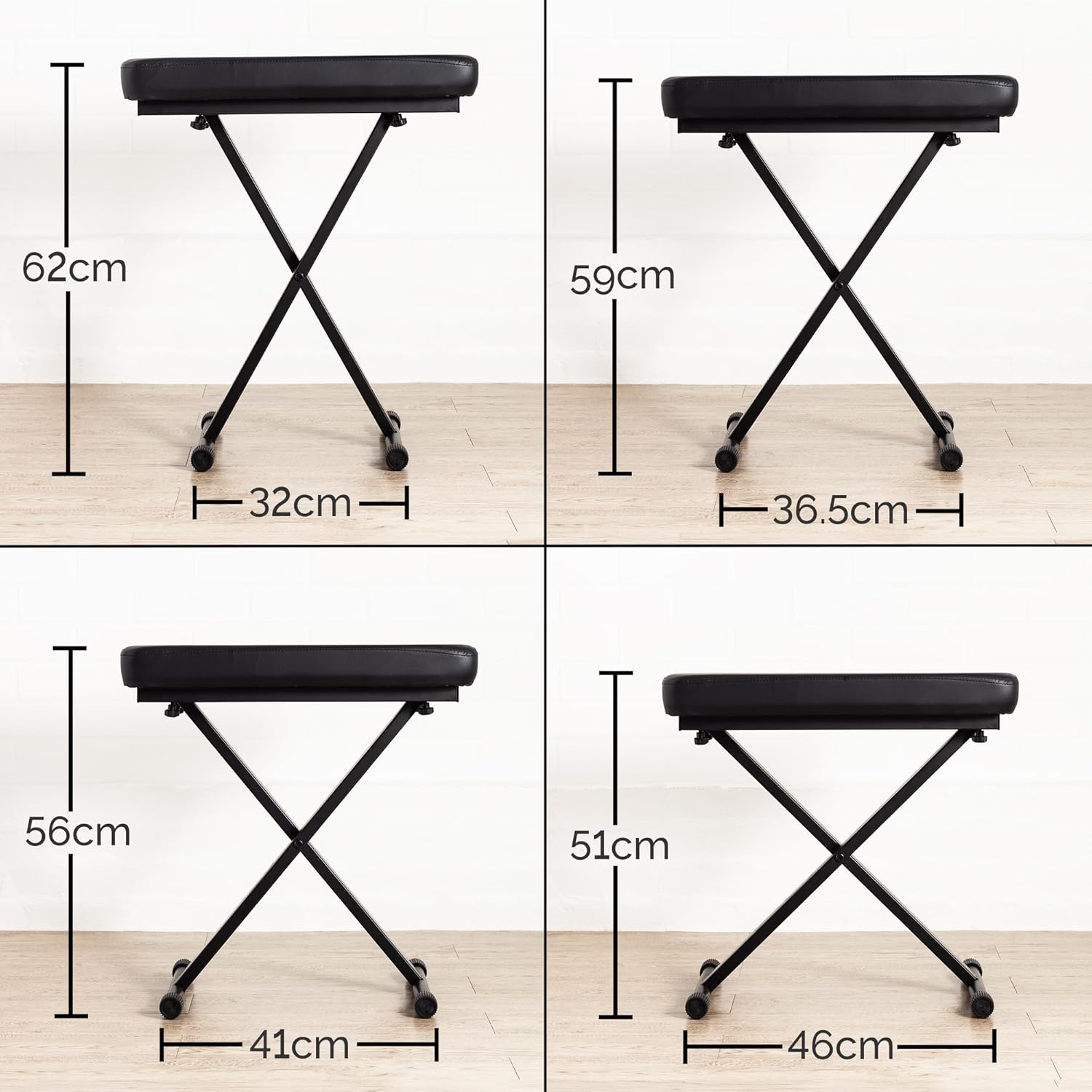 - Das grosszügig bemessene 5cm dicke Sitzpolster und der 54cmx29cm grosse Sitz lassen den Hocker selbst bei längsten Übungsstunden oder Auftritten komfortabel bleiben.