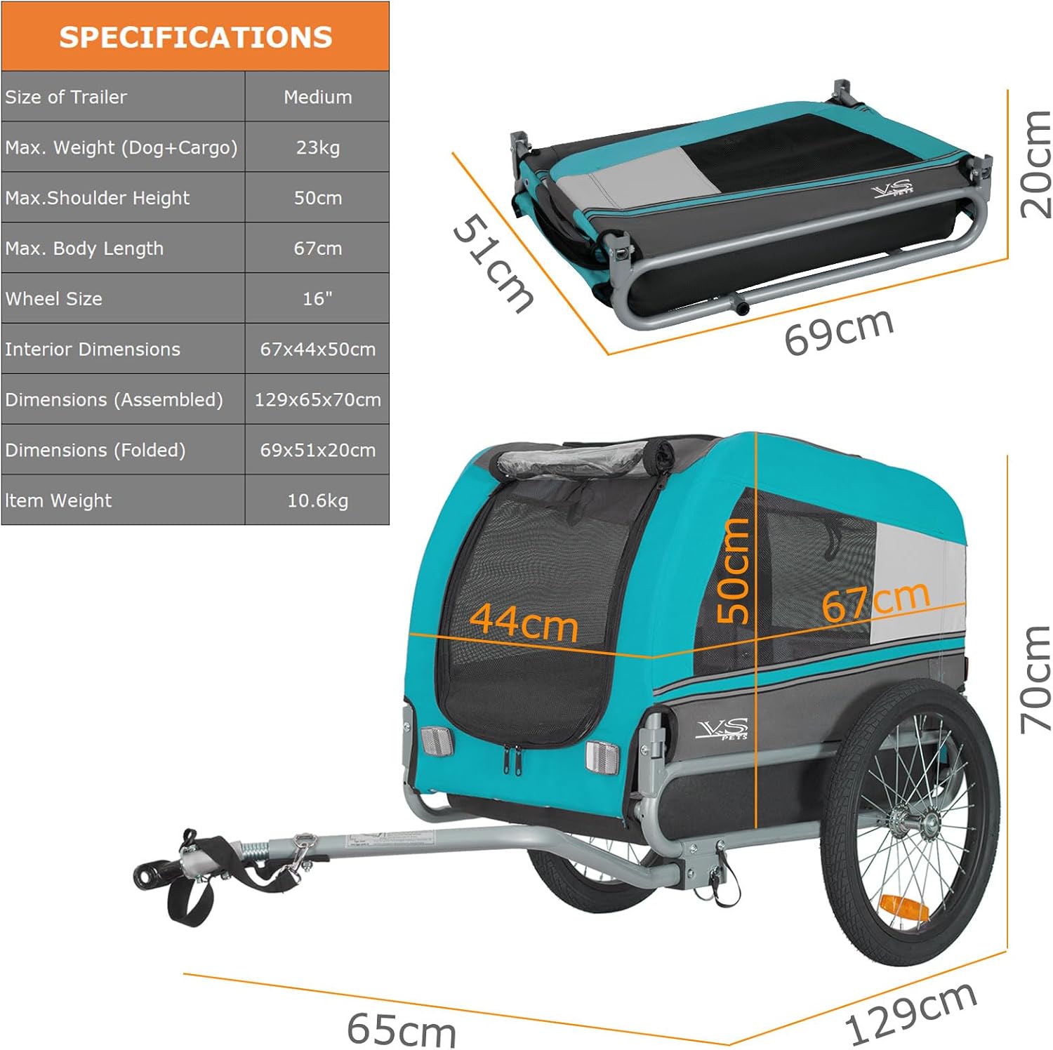 - Geeignet für kleine und mittelgrosse Hund - Maximale Schulterhöhe des Hundes: 48 cm - Maximale Zuladung: 30 kg - Abmessungen innen: 67 cm x 43 cm x 50 cm (LxBxH) - Masse zusammengebaut: 121 cm x 62 cm x 71 cm (LxBxH) - Masse zusammengeklappt: 69 cm x