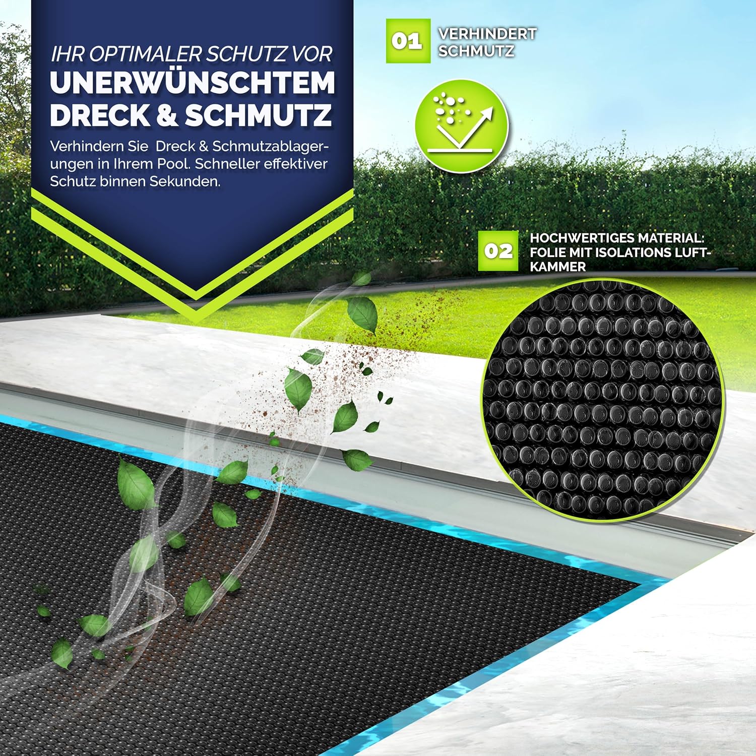 - REDUZIERTE WASSERVERDUNSTUNG: Ein positiver Nebeneffekt der Solar-abdeckplane: die Wasserverdunstung wird spürbar reduziert und es wird von einem Schmutzeinfall geschützt.
