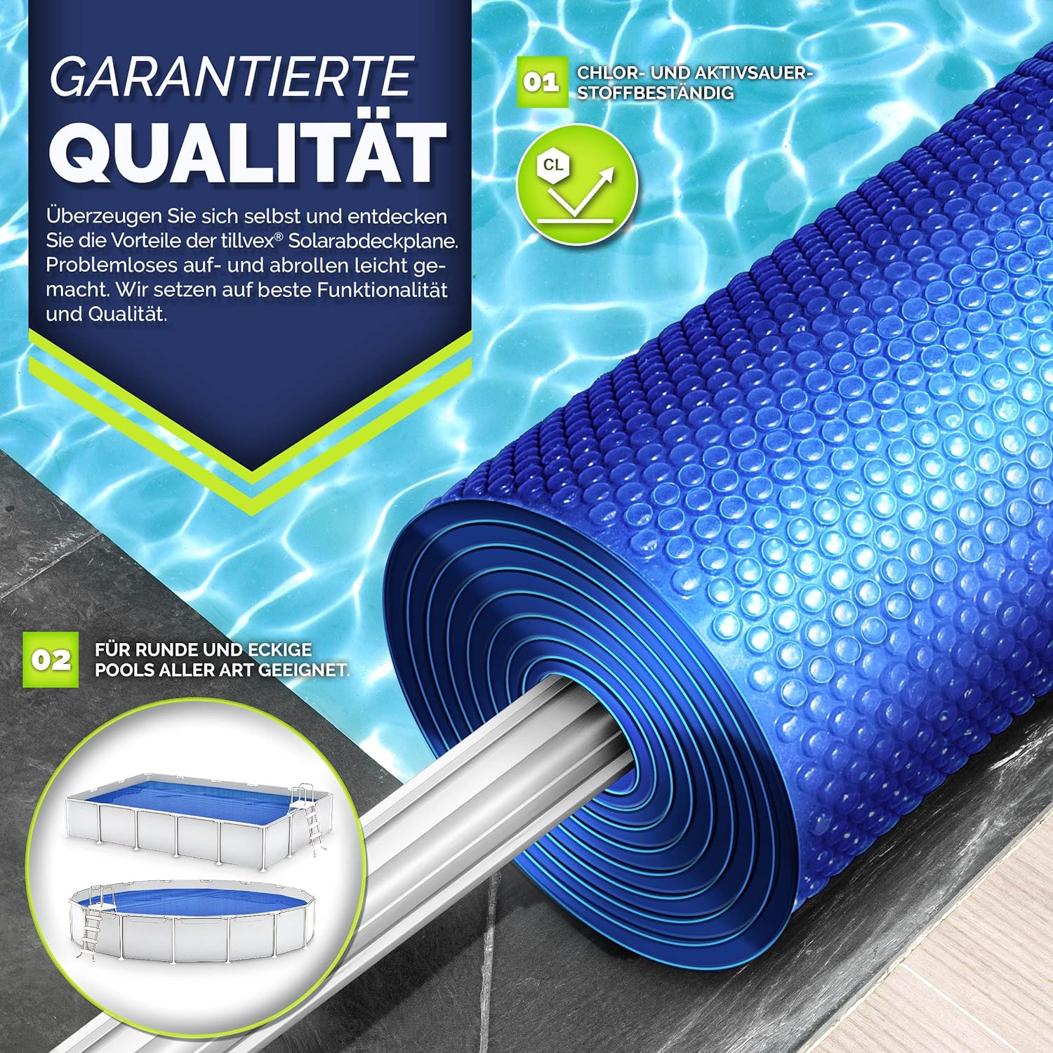 - PASSEND FÜR JEDEN POOL: Unsere Solarfolie lässt sich auf jede Grösse zuschneiden. Egal ob Rund oder Eckig, die tillvex Solarabdeckplane lässt für jede Pool-Variante verwenden.