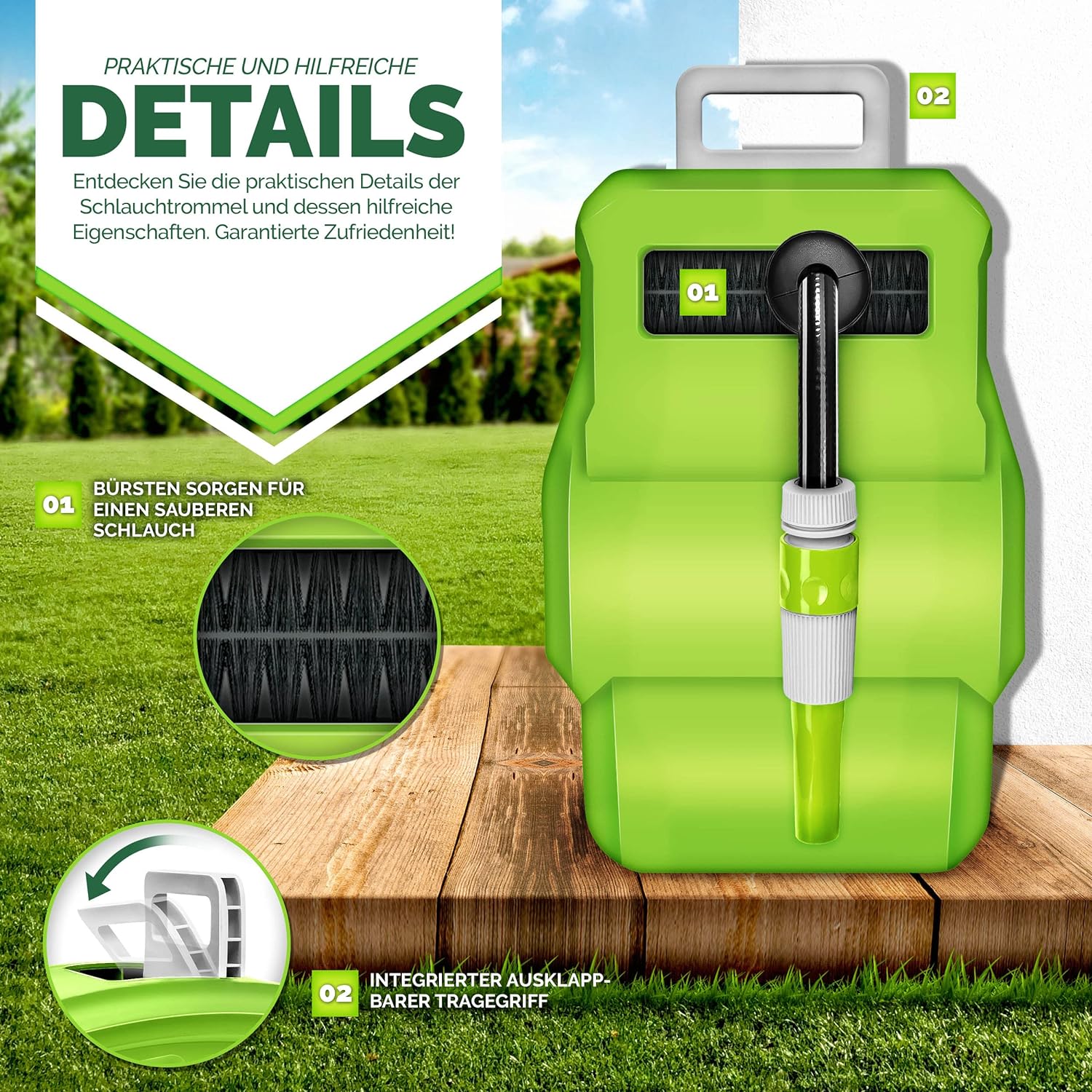 - VIELE FUNKTIONEN: Mit Aufwickelautomatik, Schlauchführung und Schlauchstopper für eine perfekte Wicklung. Zudem befindet sich im Inneren vom Schlauchaufroller eine Reinigungsbürste. Inklusive Anschluss-Schlauch an den Wasserhahn oder das Stecksystem