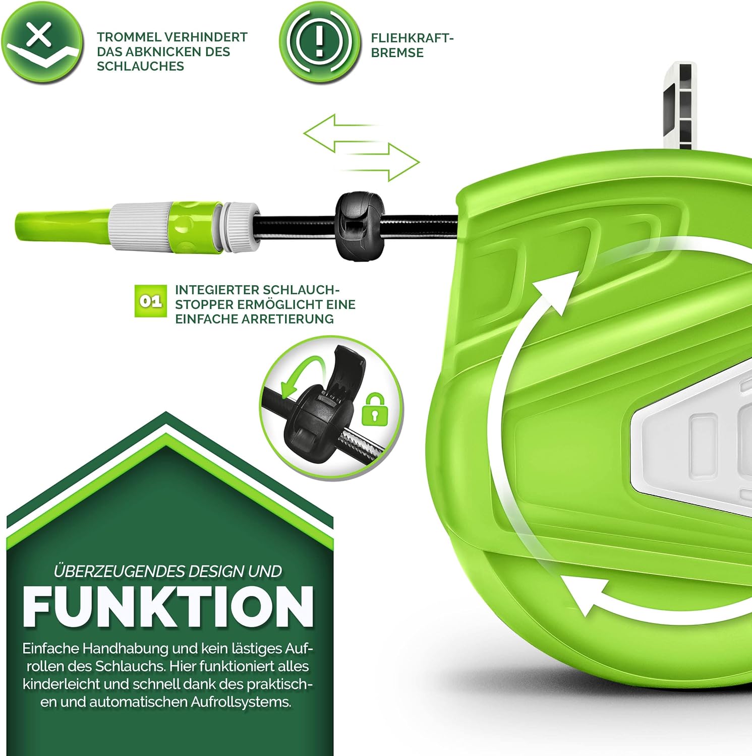 - SCHLAUCHSTOPPER & ARRETIERUNG: Der angebrachte Schlauchstopper ermöglicht mittels Klippmechanismus eine einfache Arretierung der gewünschten Position. Durch die Aufroll-Automatik und der Fliehkraftbremse lässt sich der Schlauch auf die gewünschte