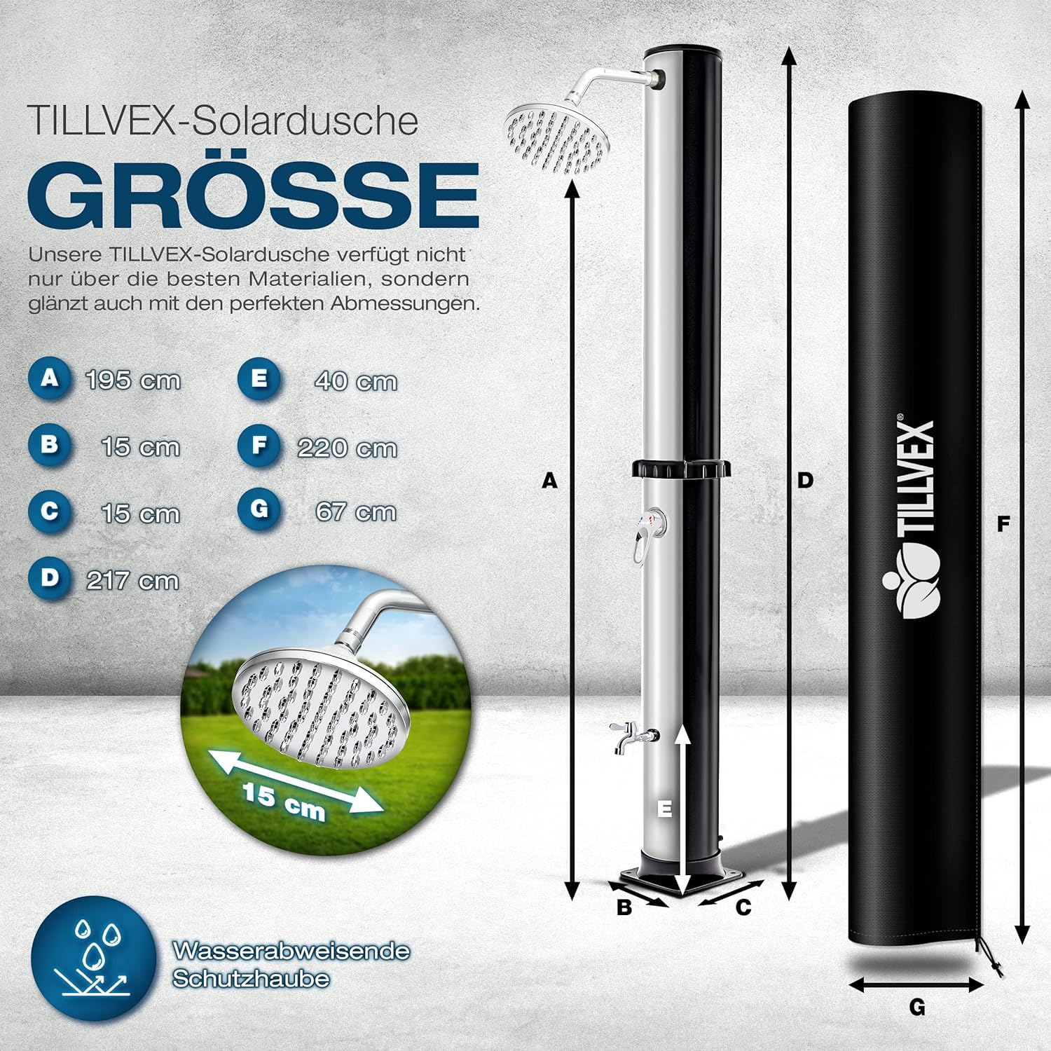 - PREMIUM SOLARDUSCHE VON TILLVEX: Solardusche von tillvex aus UV-beständigem Kunststoff-Material. Chromglänzende Armaturen und standsicherer Kunststofffuss. Moderne und edle Optik. Die mitgelieferte Abdeckung schützt Ihre Gartendusche vor äusseren Einflüssen wie Regen, Schnee, Hagel oder äusseren Beschädigungen.