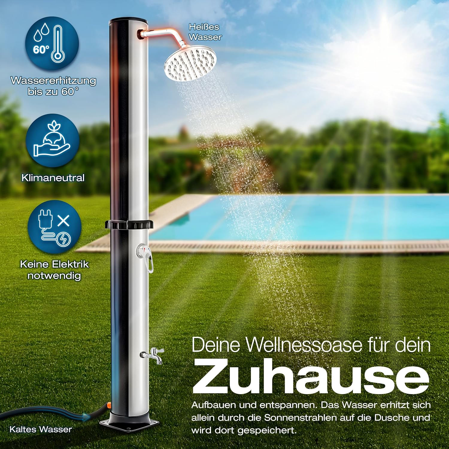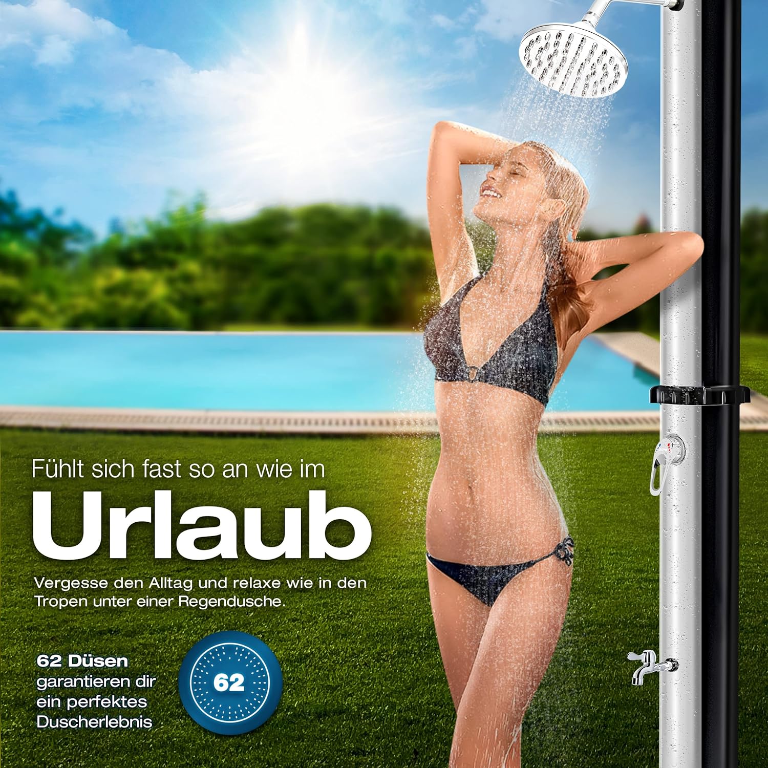 - ABKÜHLEN JEDERZEIT UND ÜBERALL: Optimal geeignet für den Einsatz im Garten, Camping oder am Pool. Schnelles Auf- und Abbauen durch Schraubverbindung im Boden. Der 20-Liter Wasser-Tank der Solardusche kann mit einem handelsüblichen Gartenschlauch befüllt werden. Das enthaltene warme Wasser wird mit durch eine Einhebelmischbatterie mit kaltem Wasser gemischt. Durch diese Technik lässt sich die Wassertemperatur stufenlos einstellen.