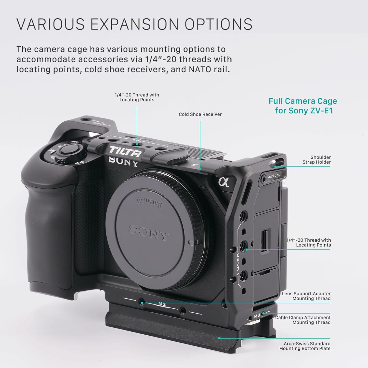 - Montagezubehör: Dieser ZVE1-Kamerakäfig bietet Platz für eine breite Palette von externem Zubehör über mehrere Befestigungsmöglichkeiten, einschliesslich eines Kaltschuh-Empfängers, NATO-Schiene, M3- und ¼-Zoll-20-Gewinde mit Positionierpunkten.