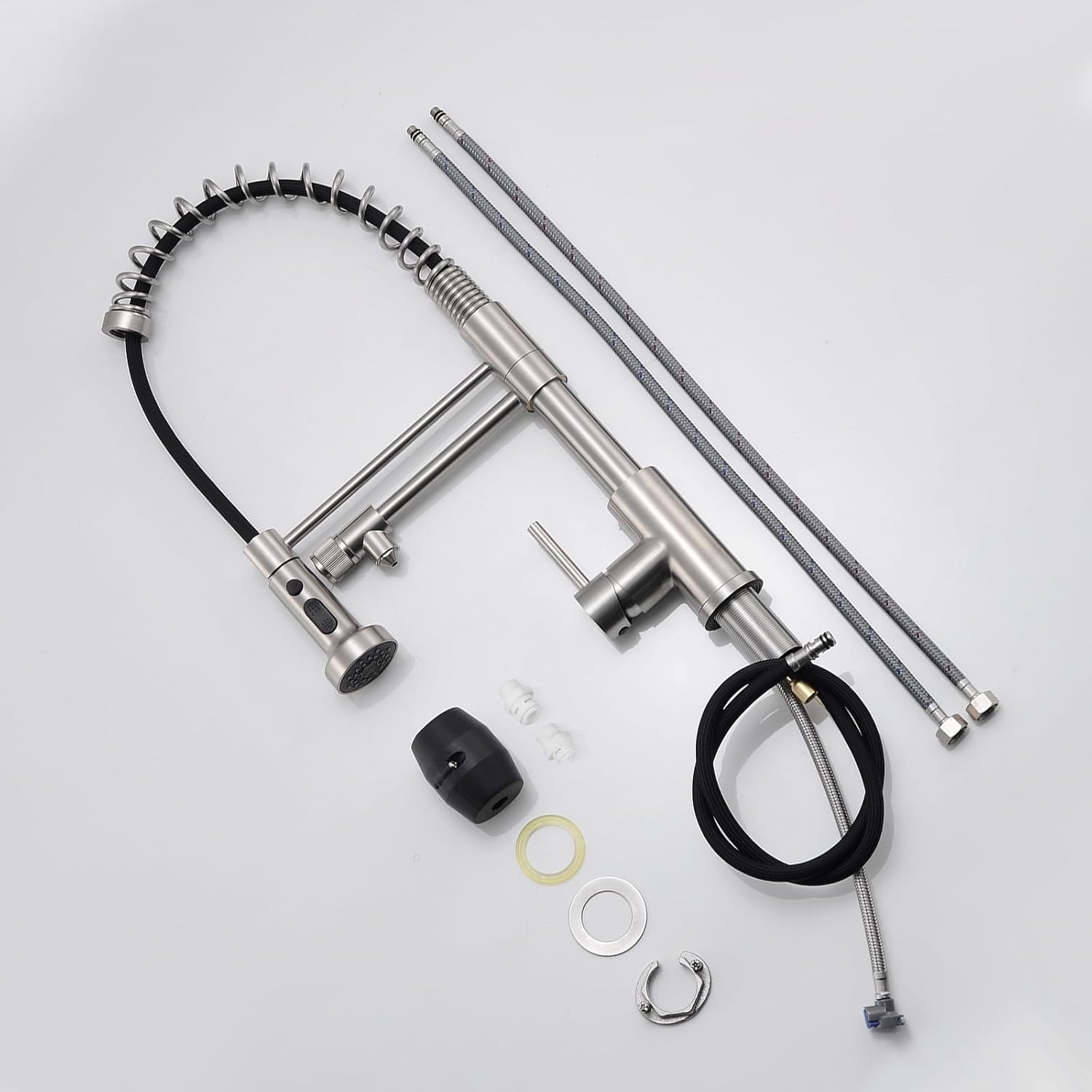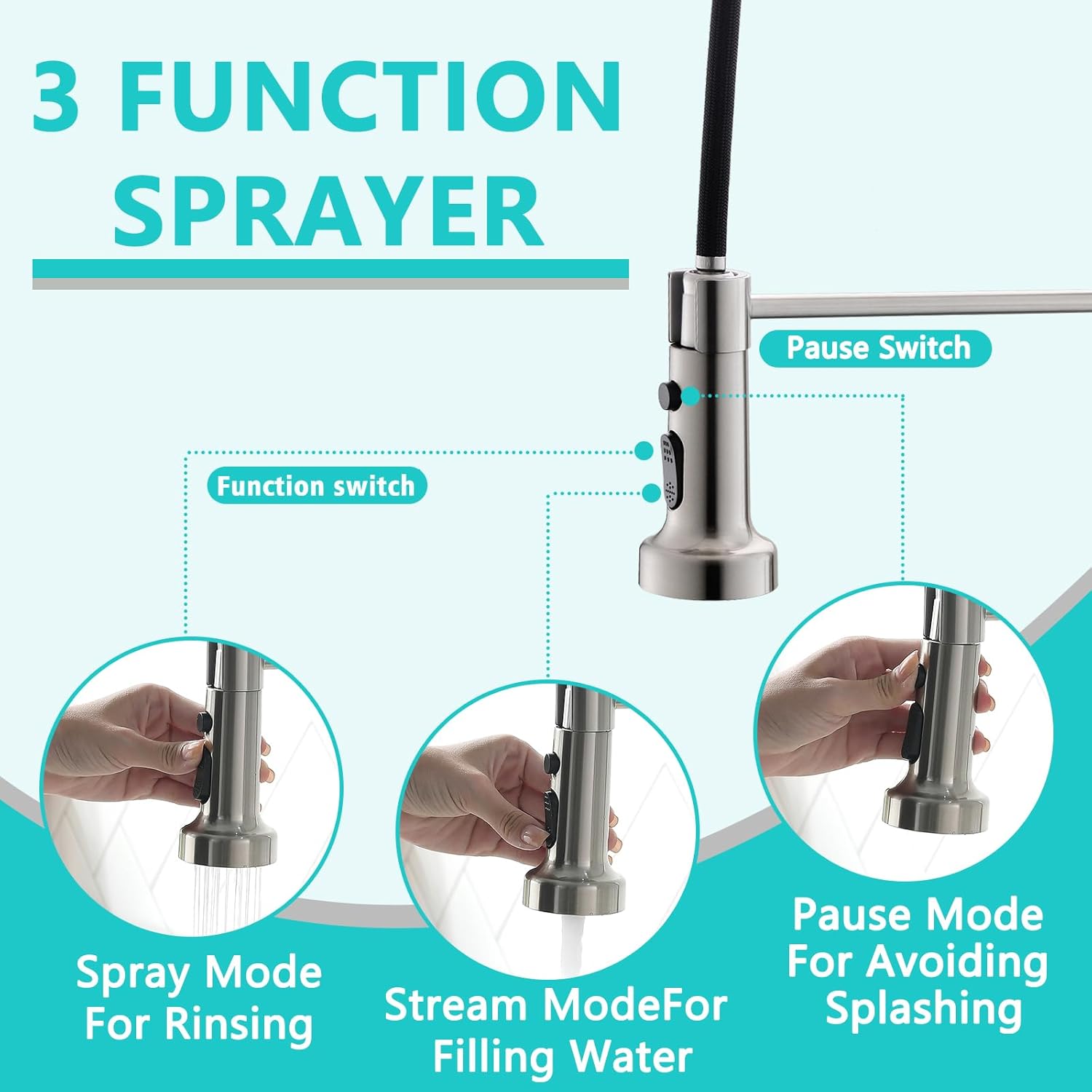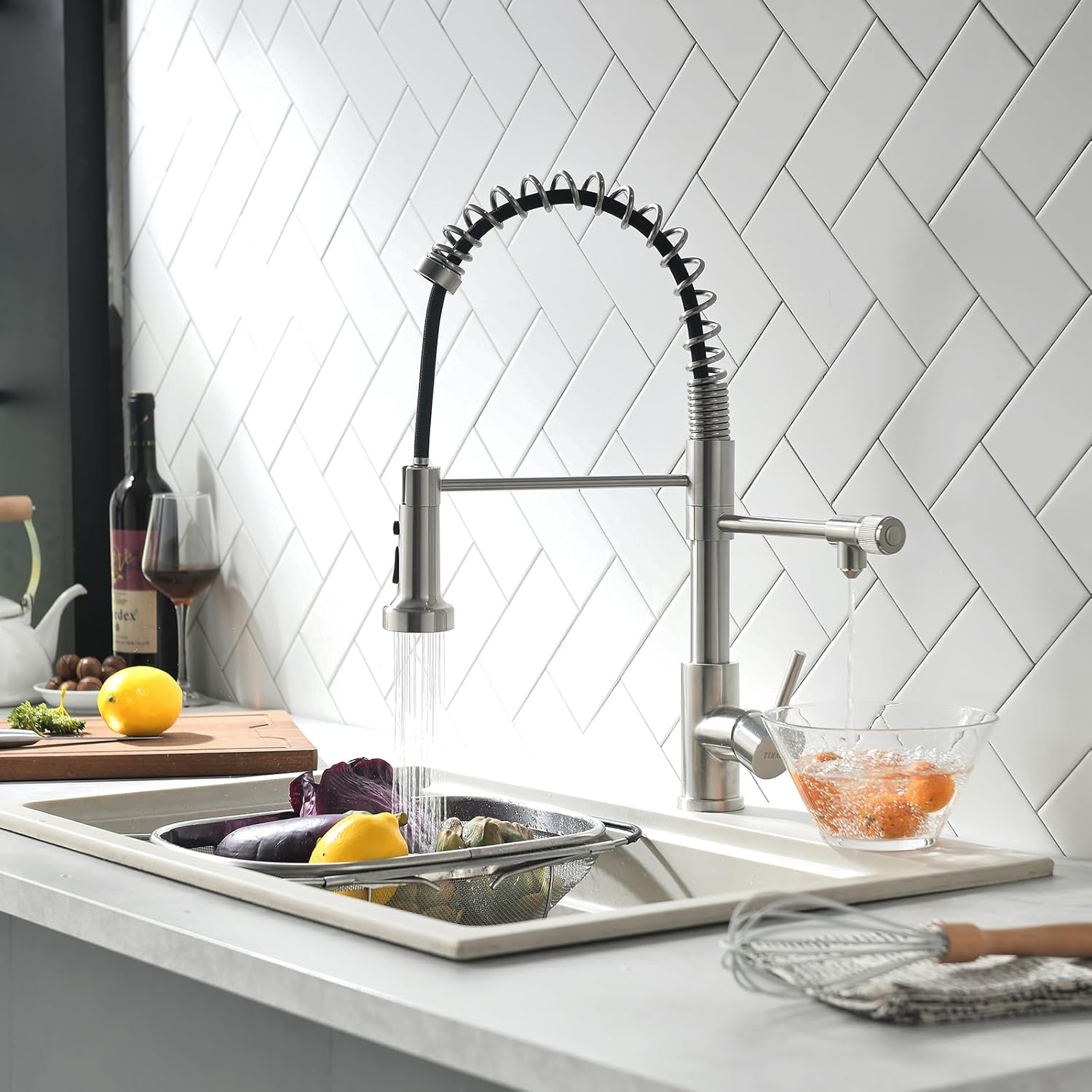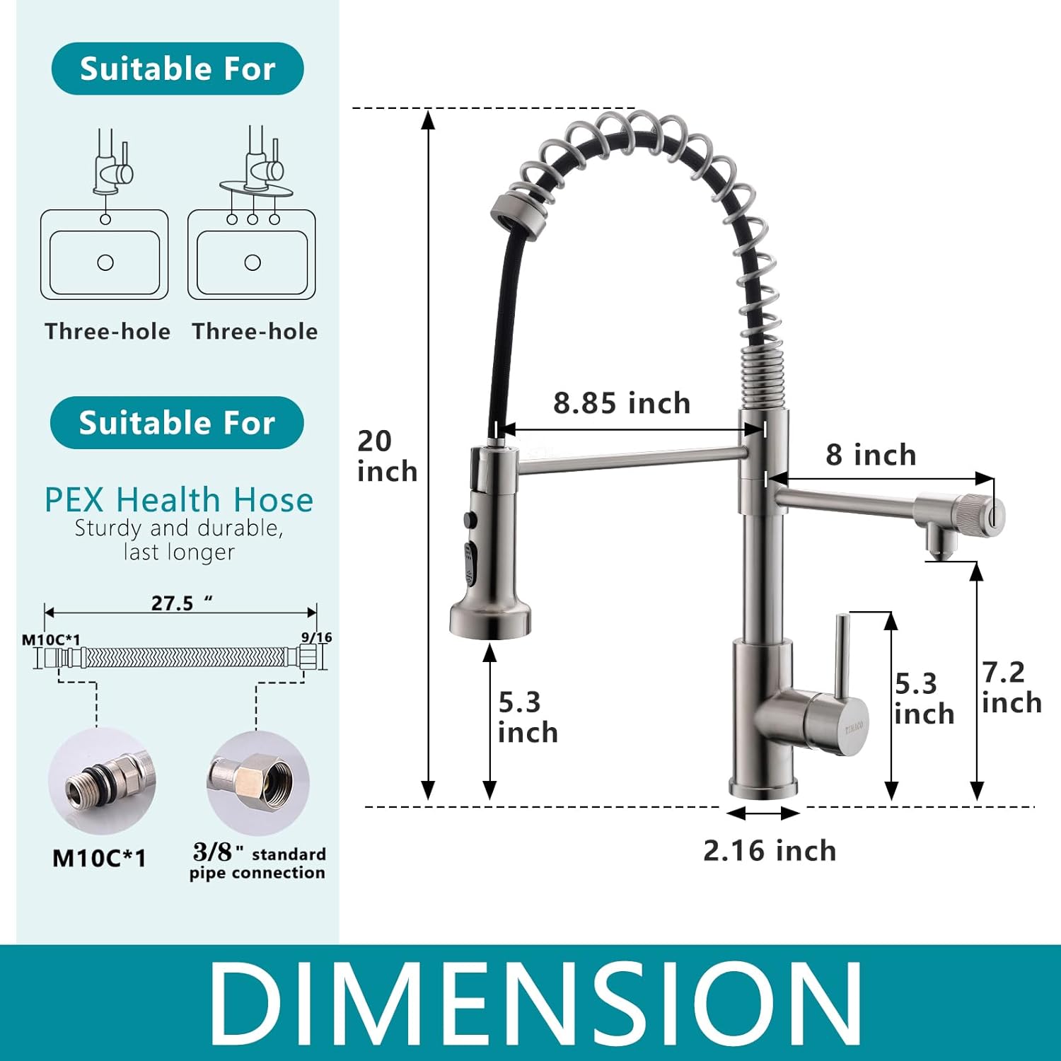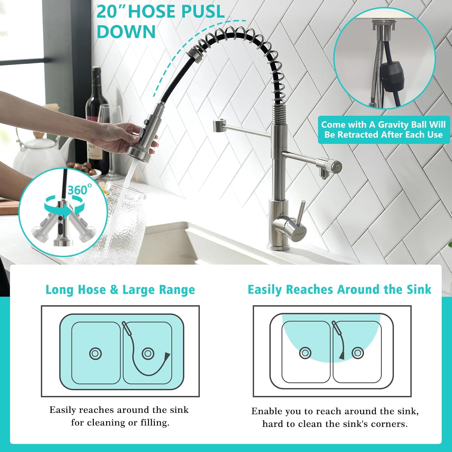 • 【Kann Herausziehen】Diese Küchenarmatur mit herausziehbarer Brause kann 20 Zoll, 50,8 cm herausziehen.Der hochdrehende 360-Grad-Auslauf mit hohem Lichtbogen bietet einen vollständigen Waschzugang.Nach jedem Gebrauch fährt die Düse immer