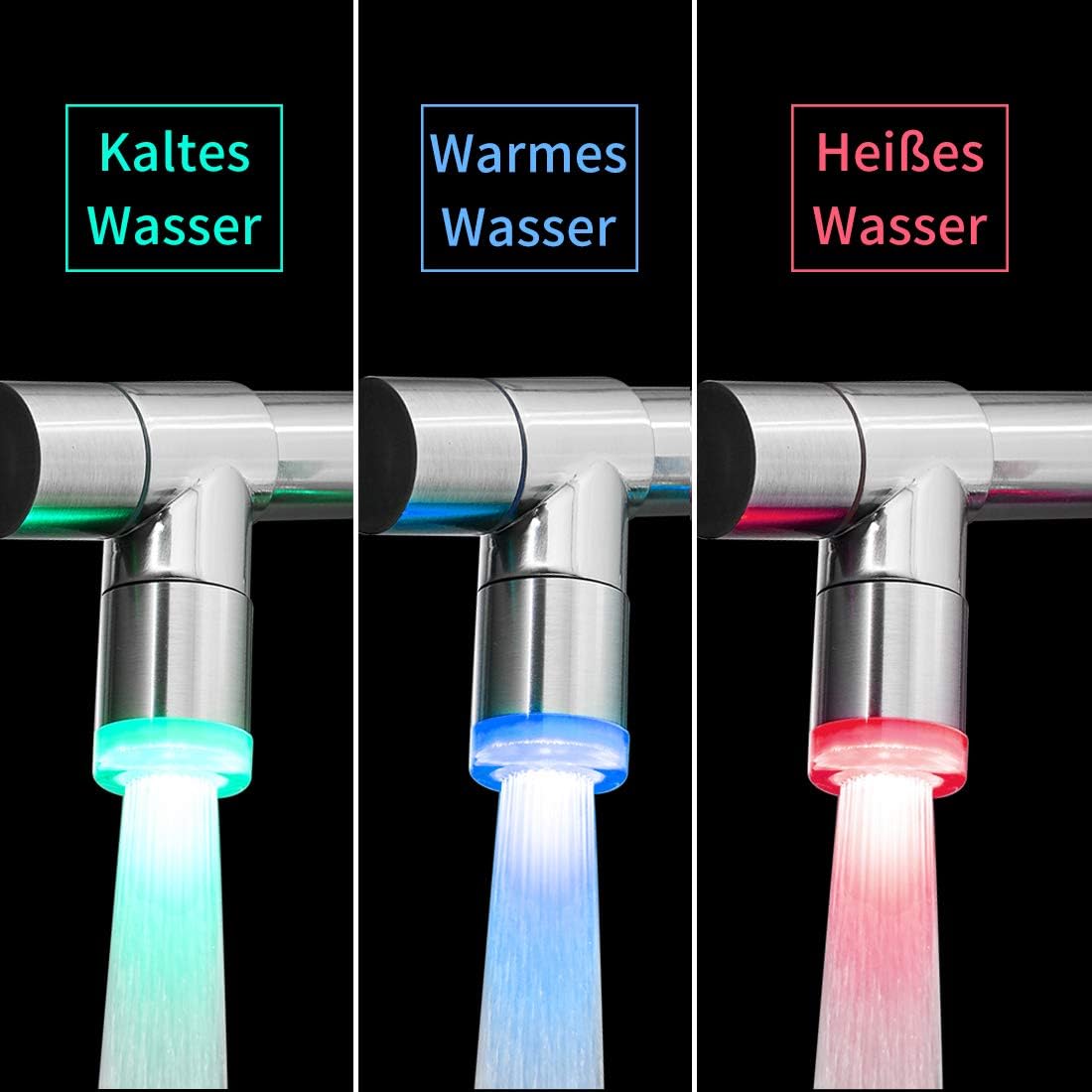 • ✔️ Farbe Funktion: Die Farbe der LED-Leuchten ändert sich automatisch über die Wassertemperatur. (Grün: Kaltes Wasser ; Blau: Warmes Wasser ; Rot: Heisses Wasser.)