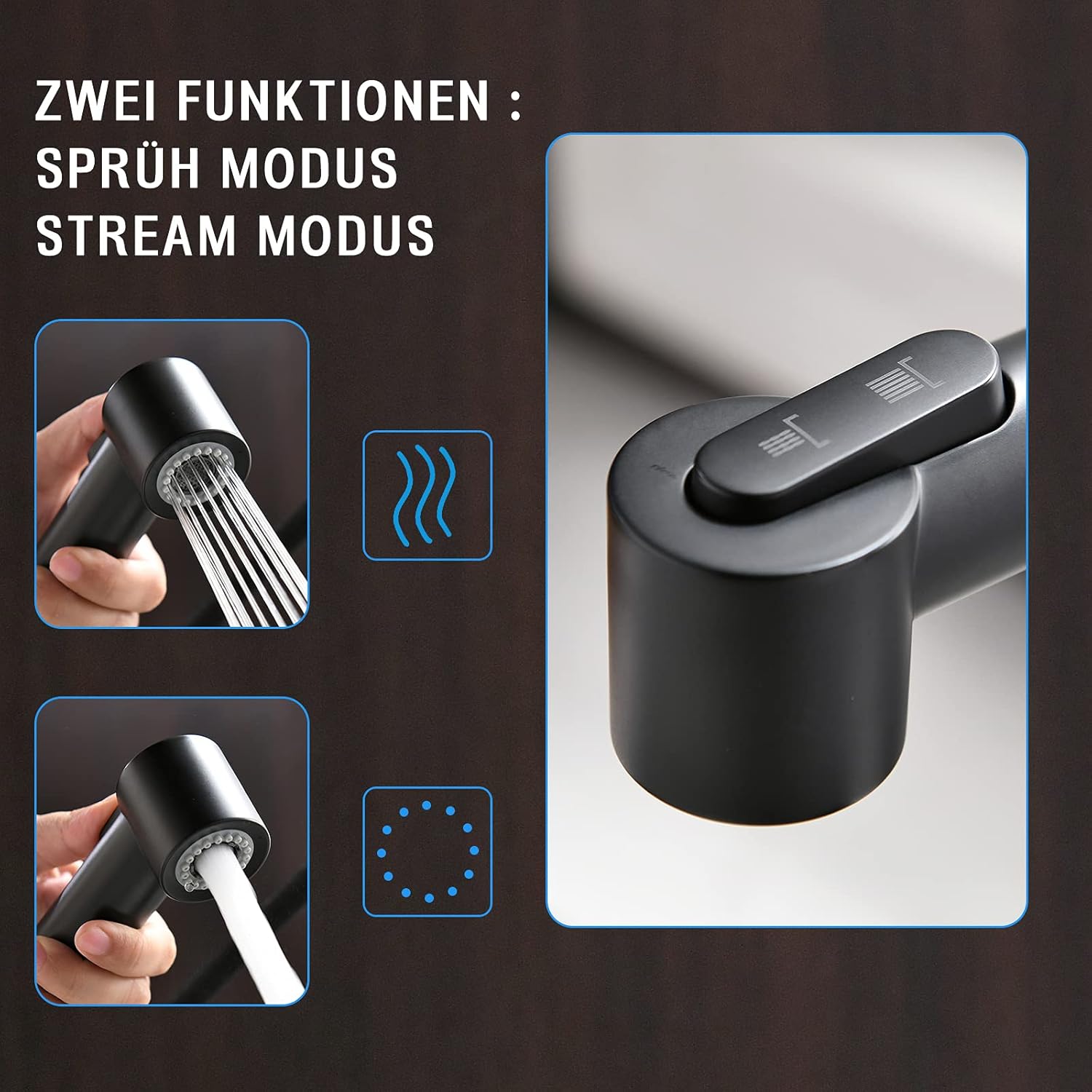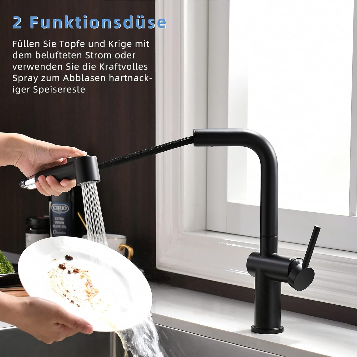 - 【Zwei-Sprühmodi und 360-Grad-Auslauf】 --- Mit zwei Sprühmodi können Sie auf Knopfdruck einfach vom spritzfreien, belüfteten Strahl zum leistungsstarken Vorspray wechseln. Schwarzer Küchenarmatur mit 360-Grad-Schwenkdüse bietet die gesamte
