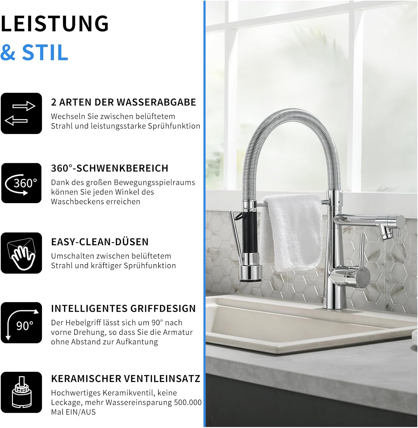 • 【NEUES KOMPAKTES FRÜHLINGSDESIGN】 Dieses Design ist flexibler, nicht nur um 360 Grad drehbar, sondern auch um 360 Grad biegbar. Der Schlauch kann jeden Bogenmass ändern. Sie müssen nicht viel Kraft aufwenden, um die Feder zu dehnen kann Ihnen und