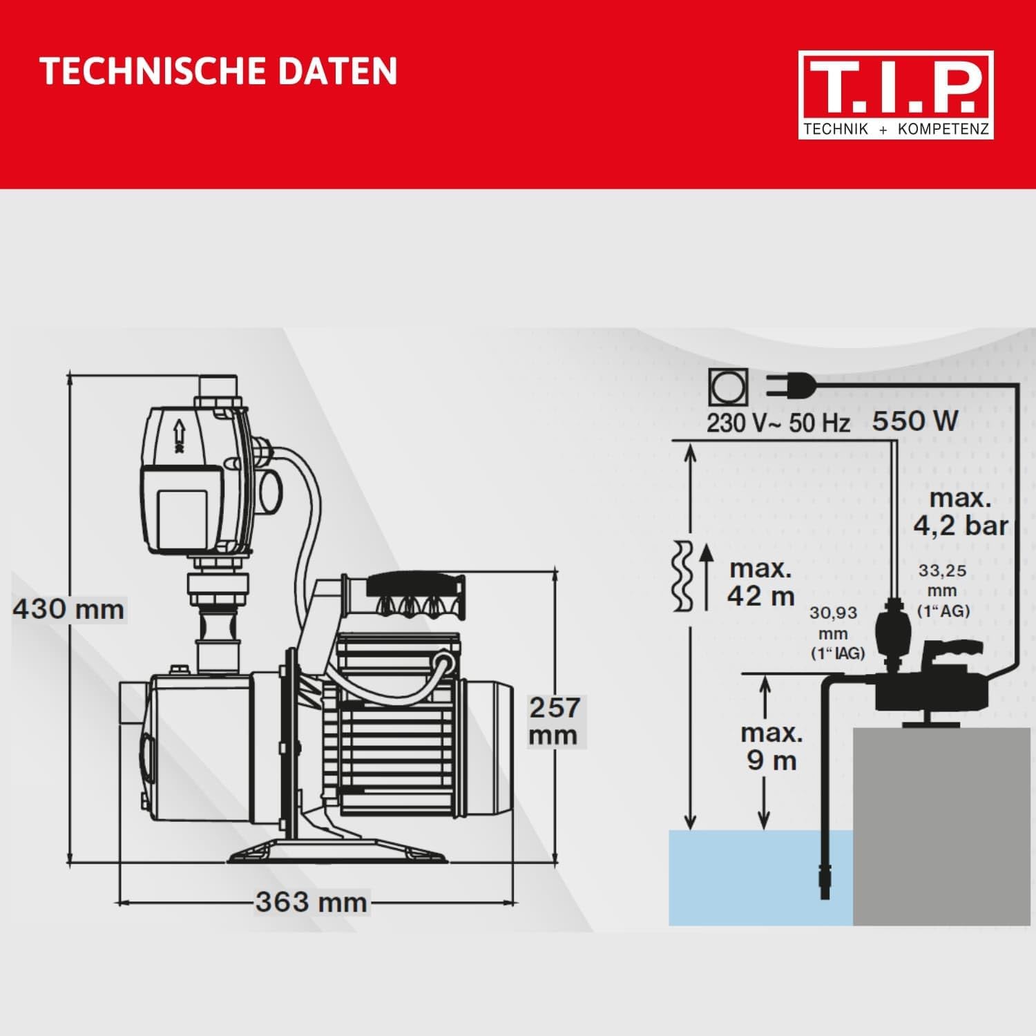 - Motor 550 Watt | Förderhöhe/Druck max.: 42m/4.2bar | Ansaughöhe max.: 9m | Fördermenge max.: 2.800 l/h | Pumpengehäuse: Edelstahl | Kabel 1.5m |Temperatur max. 35°C | Druckanschluss: AG. 33.25mm(1'') | Sauganschluss: IG. 30.93mm(1'')