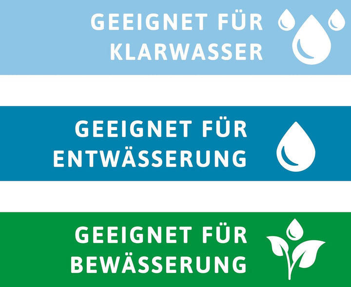 - Inklusive: 4 m Ansaugschlauch und 20 m Gartenschlauch mit 4 teiliger Anschlussgarnitur