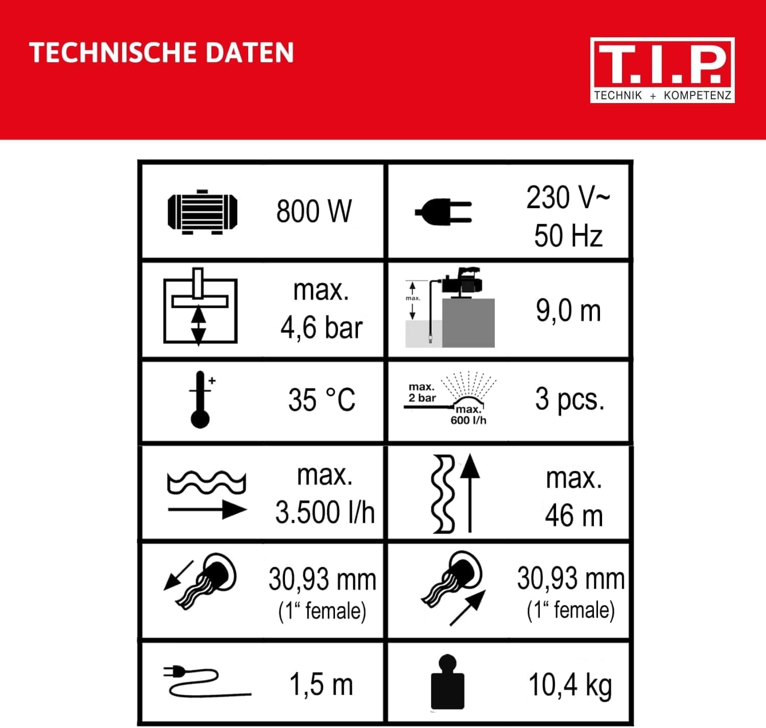 - 900 Watt / Max. Förderhöhe 46 m / Max. Druck 4,6 bar / Max. Fördermenge 3.500 l/h / Druck-&Sauganschluss 1“IG / Max. Ansaughöhe 9 m / 1,5 m Kabel