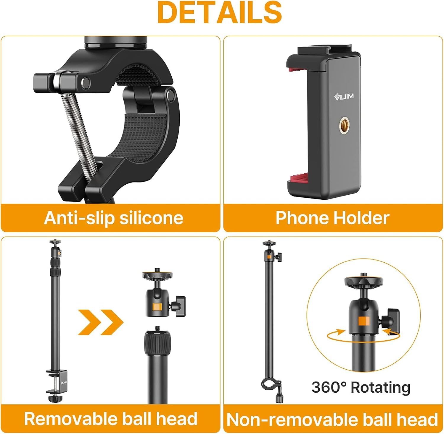 - ▶【Versatile】Es hat ¼-Zoll-Schraube und extra 360° drehbaren Kugelkopf, der perfekt mit Smartphone-Klemme (einschliesslich), Mikrofonen, LED-Licht, Ringlicht, Taschenlampe Action Cam, Webcam, Kamera, Camcorder, etc.