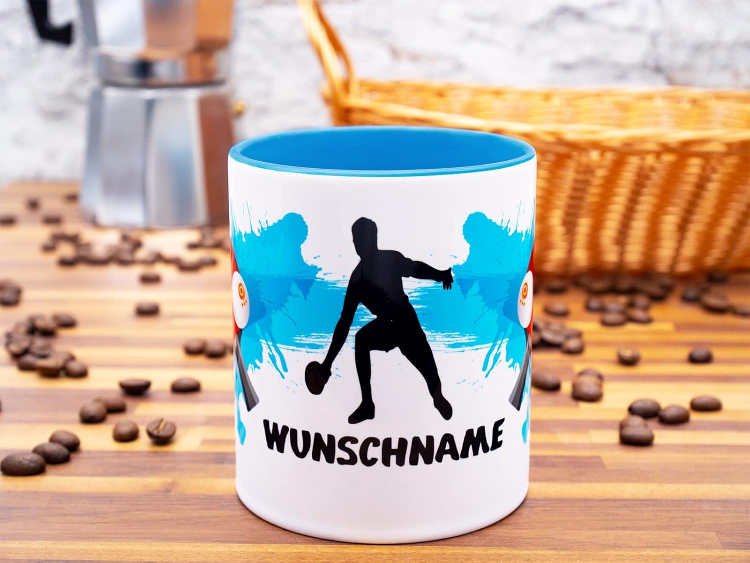 - Weisse Tasse / Becher mit blauer innen Farbe und Henkel mit Tischtennisspieler, Tischtennisschläger & Tischtennisball Motiv und deinen Wunschnamen. Masse Höhe: 9,5 cm - Ø 8,3 cm - Gewicht: 340 Gramm - Volumen: 330ml - Material: Keramik