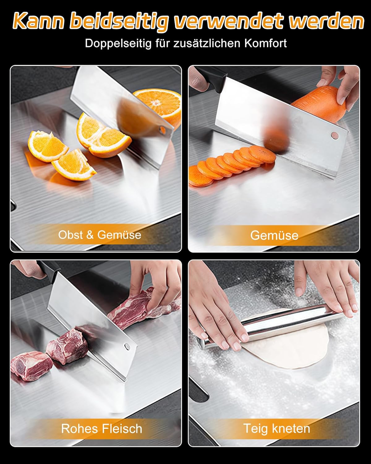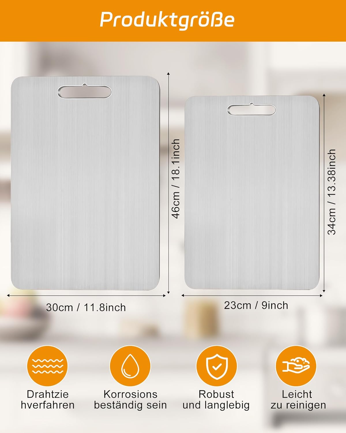 - 🔪 𝗠𝗲𝘀𝘀𝗲𝗿𝗳𝗿𝗲𝘂𝗻𝗱𝗹𝗶𝗰𝗵: Unser Titan-Schneidebrett schützt Ihre Messer – im Gegensatz zu Stein, Glas oder Stahl, die Klingen stumpf machen. Da Titan dreimal weicher ist als Stahl, bleiben Ihre Messer
