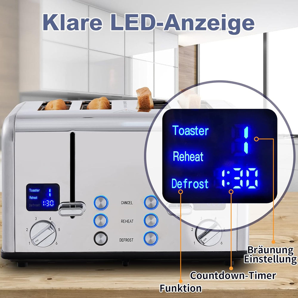 - [Digital Toaster] Der ultraklare LED-Bildschirm zeigt nicht nur den Countdown-Timer an, sondern auch den Bräunungsgrad und die Funktionseinstellung. So können Sie während des Toastens eine Tasse Milch oder Saft holen oder ein anderes Frühstück zubereiten, ohne lange warten zu müssen, was Ihnen einen effizienten Morgen beschert.