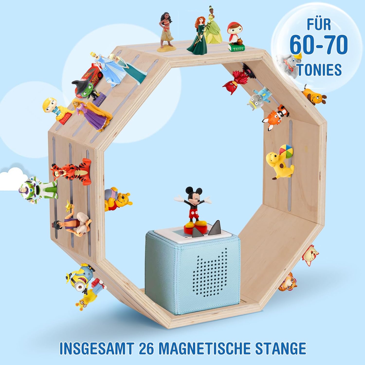 - Extragrosse Aufbewahrungskapazität: Das Toniebox-Regal ist raffiniert konzipiert, um 60-70 Tonie-Figuren aufzunehmen. Es bietet reichlich Platz für die wachsende Sammlung Ihres Kindes und verstaut mühelos Tonieboxen samt Ladestationen, was die