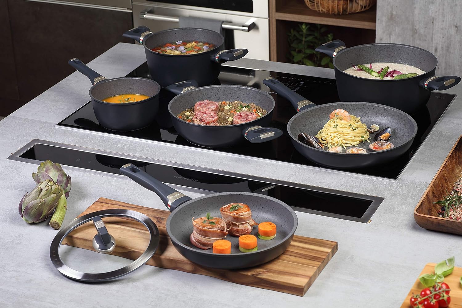• Bakelite-Griffe mit Soft-Touch-Griffen, rutschfest und verbrühungsfest
