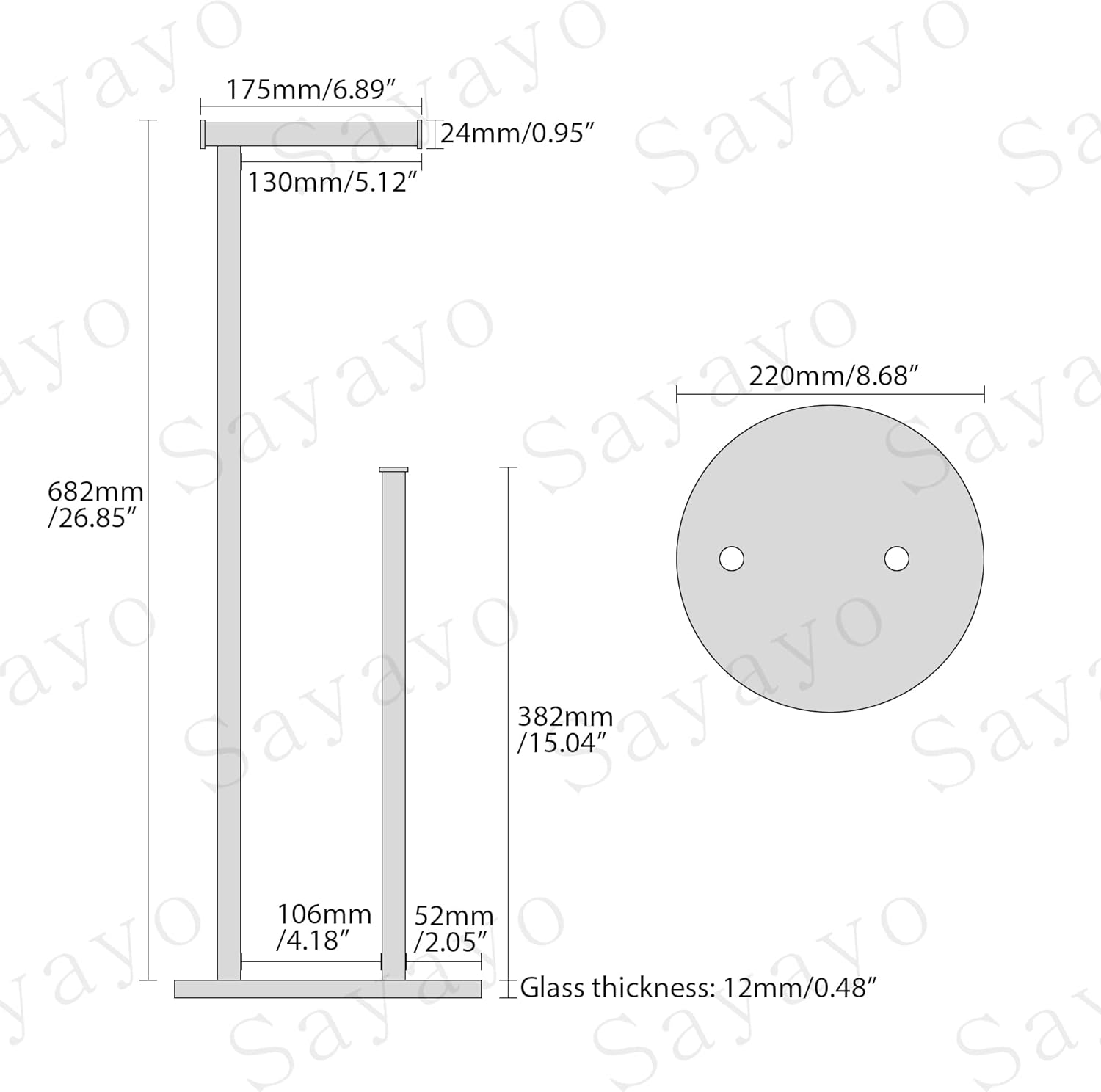 • Produktgrösse - Basis: 25 cm Durchmesser, Glasdicke: 12 mm, Höhe (vom Boden bis zur Spitze): 70 cm, die Höhe der Aufbewahrungsstange beträgt 382 mm.