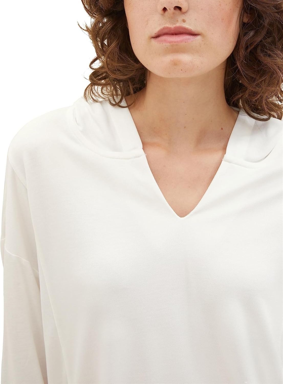 - Sportliches, moderenes Hoodie TShirt im MaterialMix mit 3 oder 4Ärmeln, Kapuze und VCutOut Detail am Ausschnitt Mit Ziernähten auf der Vorderseite und elastischem Saum