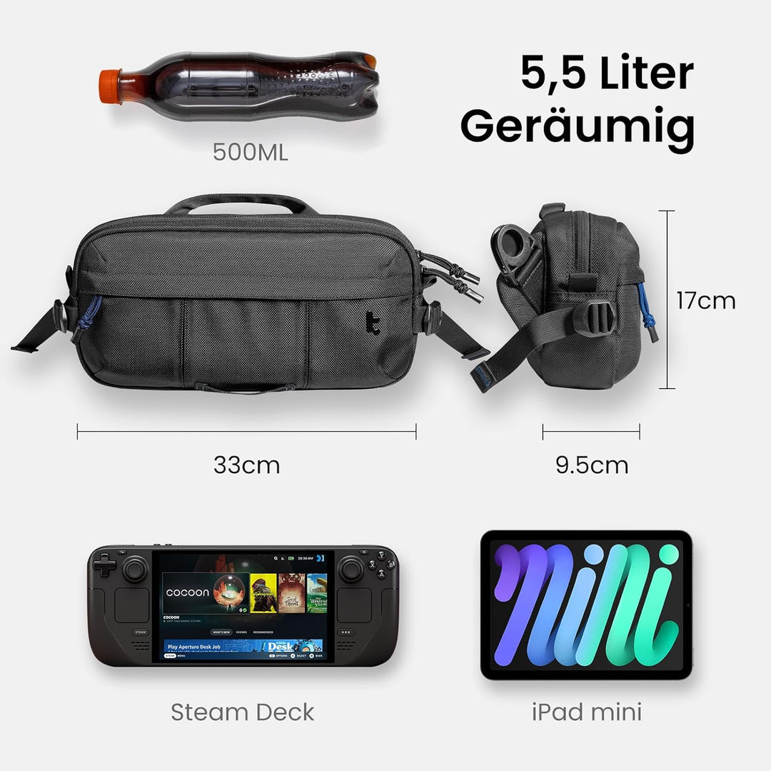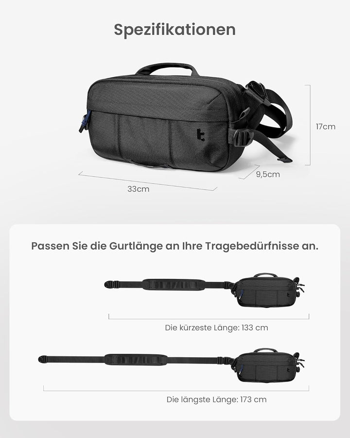 - tomtoc Wander-T26 Sling Bag: Diese Slingtasche ist von einer Urban Ästhetik geprägt und stellt eine zeitgenössische Interpretation dar. Er sieht nicht nur schick aus, sondern ist auch sehr leistungsstark. Diese vielseitige Tasche ist ideal