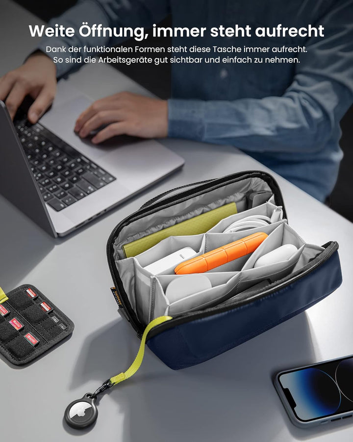 - Eine durchdachte Zubehörtasche: Diese Tech-Tasche organisiert technisches Zubehör und sorgt für einen reibungslosen und geordneten Arbeitstag. Sie verpackt auch alle Ihre kleinen Alltagsutensilien. So können Sie sie sofort mitnehmen, wenn Sie
