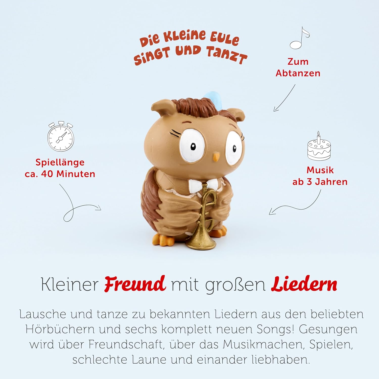 • Lieferumfang & Details – Tonie-Figur Eule, inkl. 10 Kinderlieder: Die Eule mit der Beule – Die kleine Eule singt und tanzt. Das 2. Liederalbum, für Kinder ab 3 Jahren, Spielzeit ca. 40 Minuten