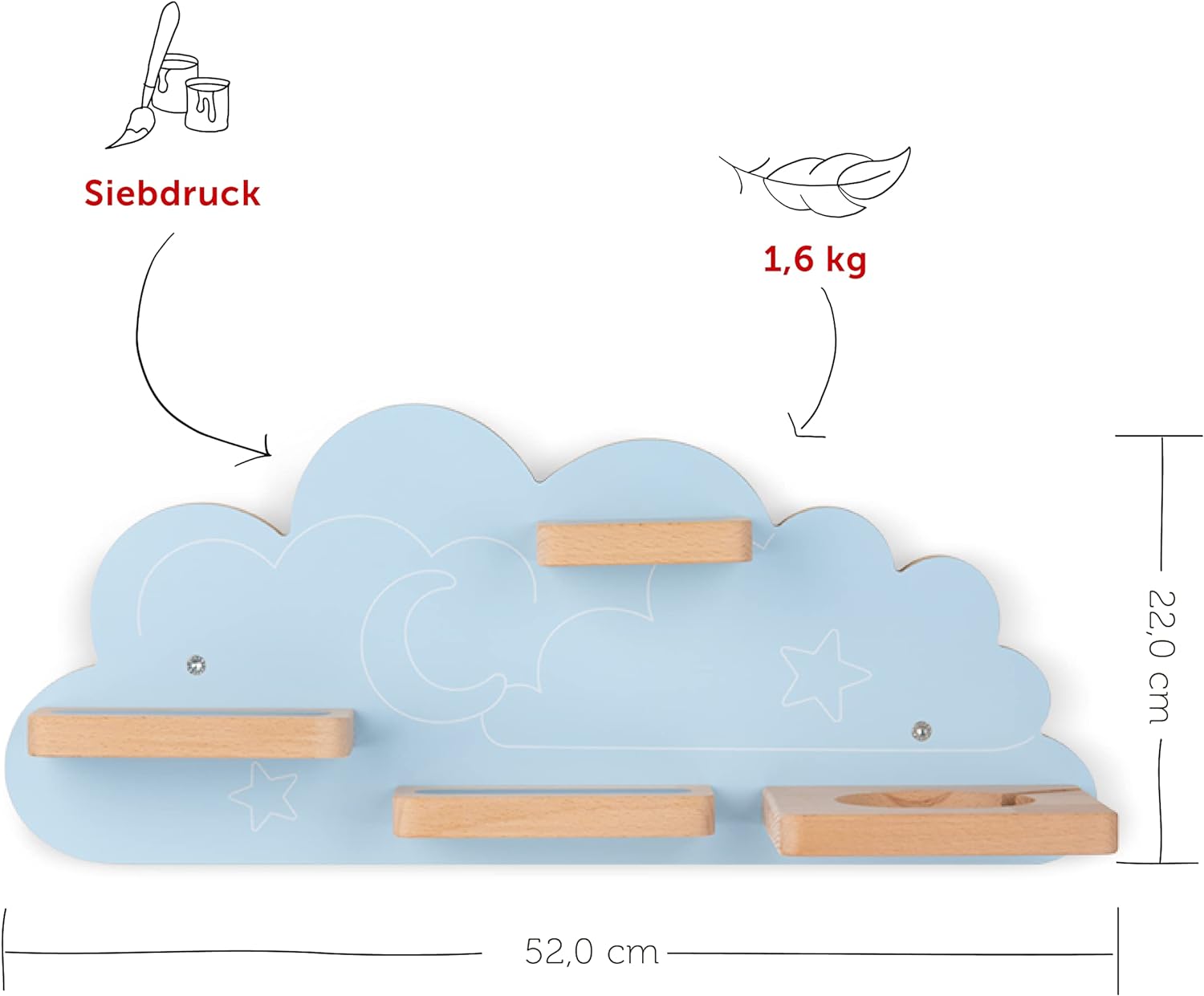 • Lieferumfang & Details – Toniebox Regal "Auf der Traumwolke" mit Bedienungsanleitung & Befestigungsmaterial, Masse: 520 x 220 x 16 mm, Material: MDF & massives Buchenholz, Farbe: Himmelblau.