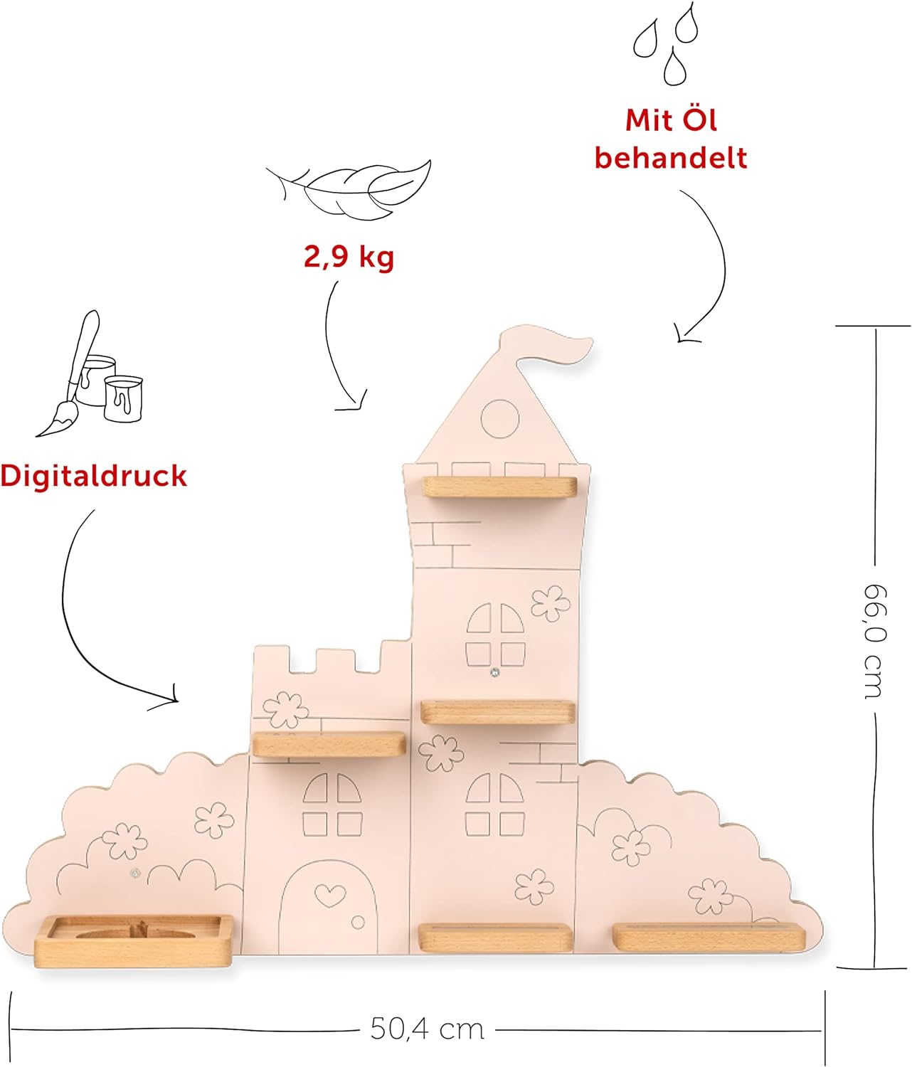 - Lieferumfang & Details – Toniebox Regal "Im Zauberschloss" mit Bedienungsanleitung & Befestigungsmaterial, Masse: 660 x 504 x 16 mm, Material: MDF & massives Buchenholz, Farbe: Puderrosa.