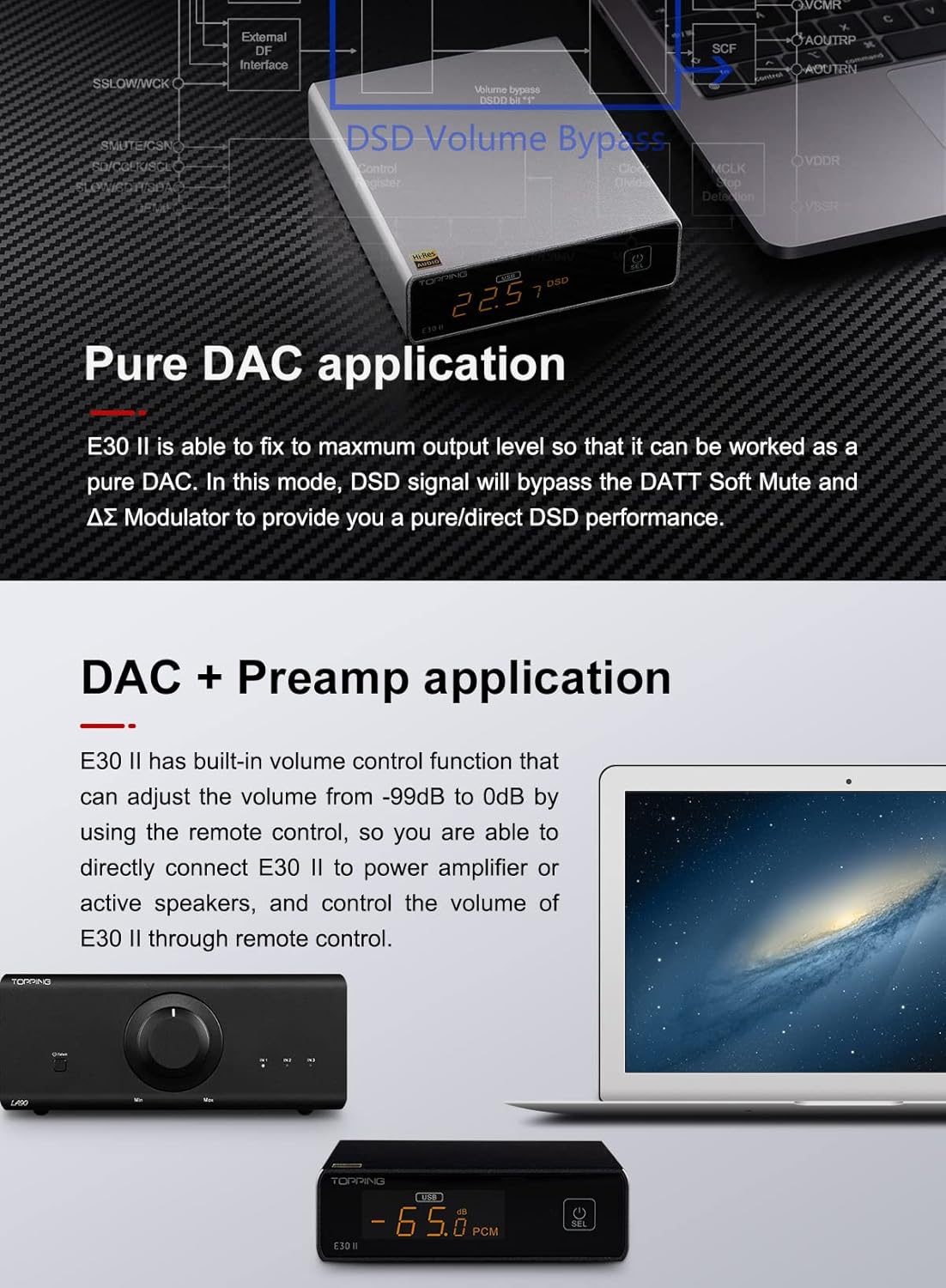 • 👍 Reine DAC & DAC + Preamp Anwendung ▶️ E30 II verfügt über eine integrierte lautstärkeregelung funktion, die die Lautstärke mit der Fernbedienung von -99 dB bis 0 dB einstellen kann , sodass Sie den E30 II direkt an einen Leistungsverstärker