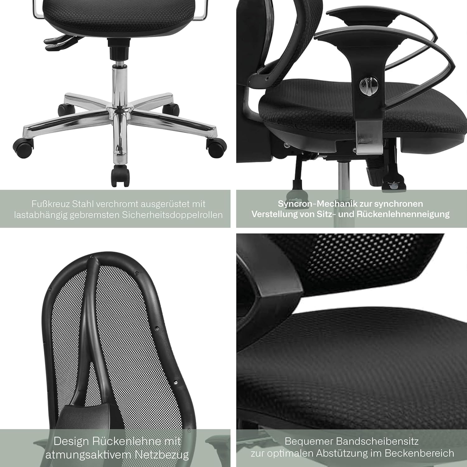 - Der Bandscheibensitz dieses Stuhls wurde entwickelt, um eine optimale Abstützung im Beckenbereich zu bieten. Mit seiner Punktsynchronmechanik, die federkraftverstellbar und arretierbar ist, sorgt dieser Stuhl für eine ergonomische Sitzhaltung und