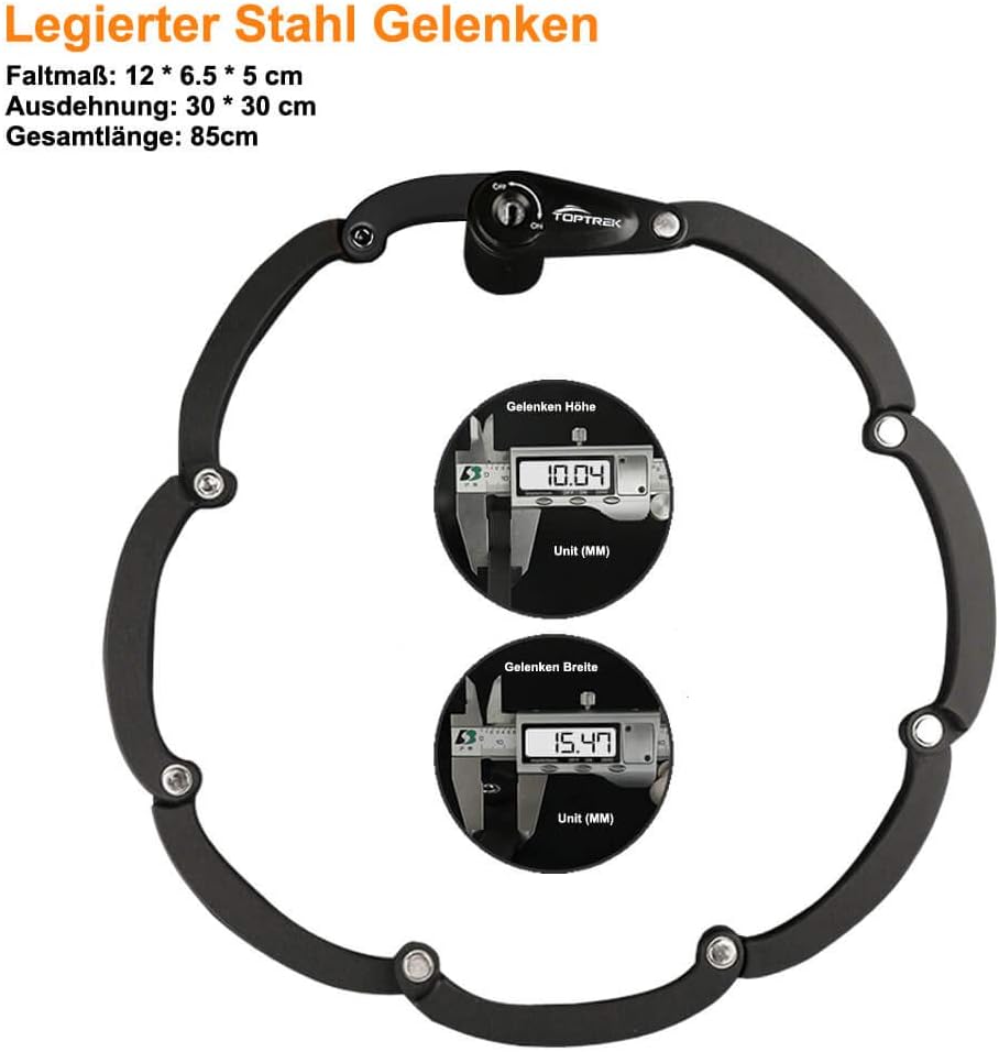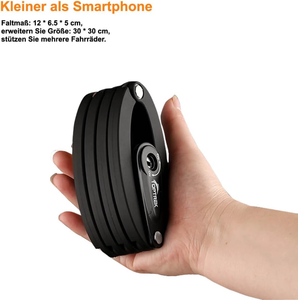 - 【Ultrastarker Stahl - schützen Sie Ihr Fahrrad】 Toptrek faltendes Schloss wird aus dem starken Stahl hergestellt. Das Fahrradschloss ist stark, Anti-sägen, Anti-bohren, mit Rostschutzfunktion. Mit B level Lock Core war es ein Level 10