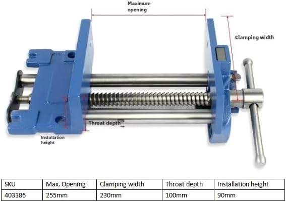 - 230 mm Backenbreite, 255 mm maximale Öffnung, 103 mm Throat-Tiefe