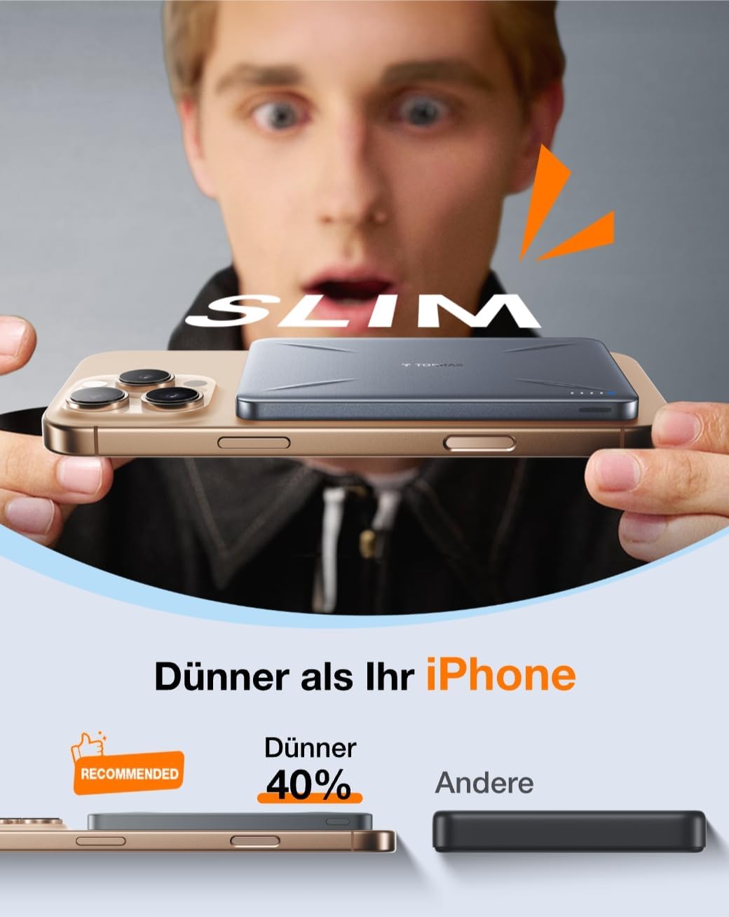 - [Kompakt und handlich] Diese Ultra-Slim MagSafe Powerbank vereint Kapazität und Tragbarkeit in einem kleinen,leistungsstarken Paket。Mit einer Dicke von nur 0,8 cm ist es unglaublich dünn und leicht und passt perfekt zu Ihrem iPhone. Es passt perfekt