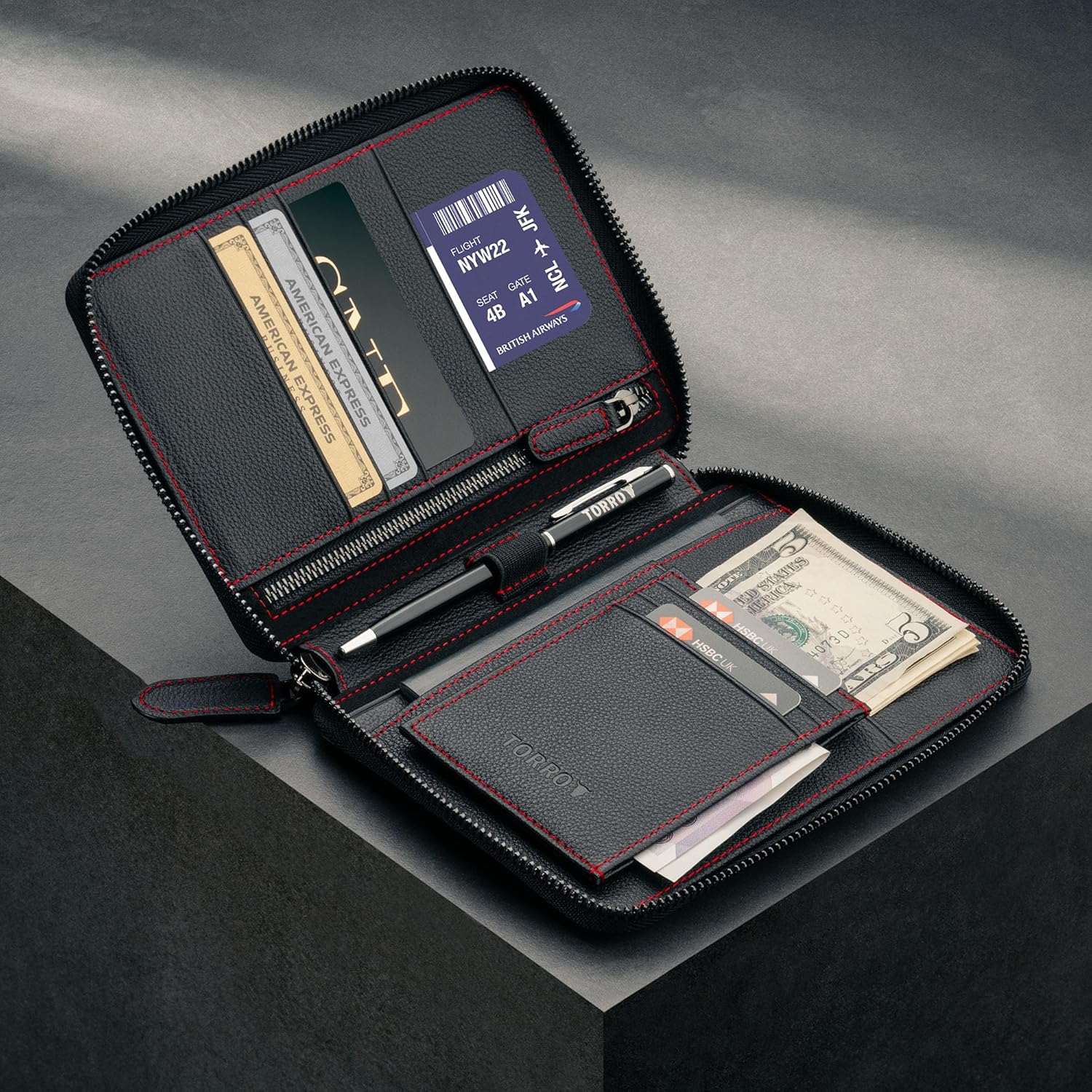 - ZUSÄTZLICHE EIGENSCHAFTEN - Die Reisebrieftasche verfügt über ein abnehmbares Kartenetui, in dem Sie Ihre Kredit- und Debitkarten griffbereit aufbewahren können. Ein Stift der Marke TORRO ist ebenfalls enthalten und wird in der elastischen