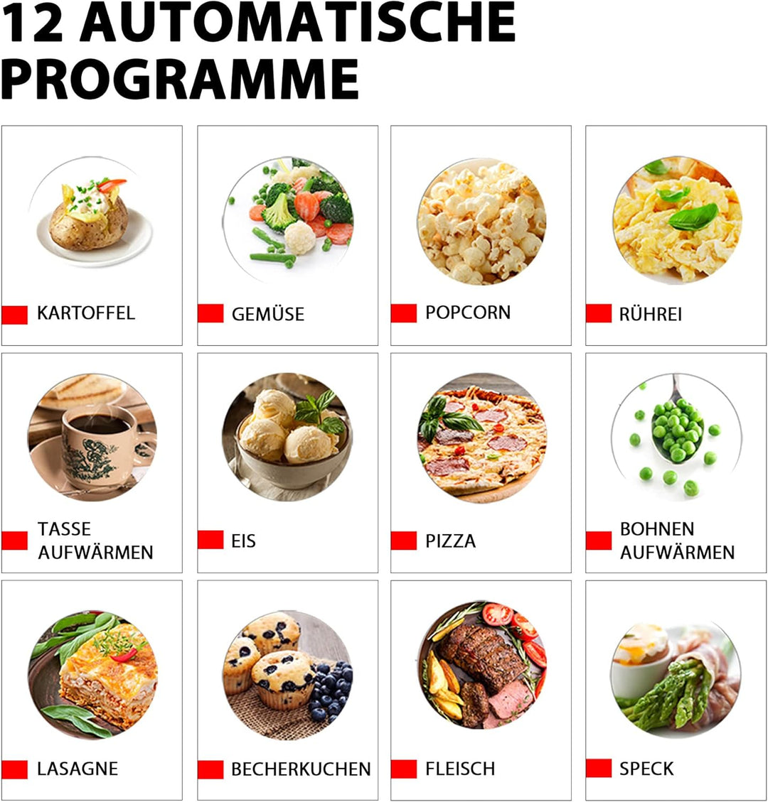- 【12 einfache & praktische automatische Programme】 An der Oberseite der Mikrowelle befindet sich ein Aufdruck mit automatischen Programmen, um Ihnen die Zubereitung von 12 beliebten Speisen wie Pizza, Kartoffeln, Gemüse usw. zu erleichtern.