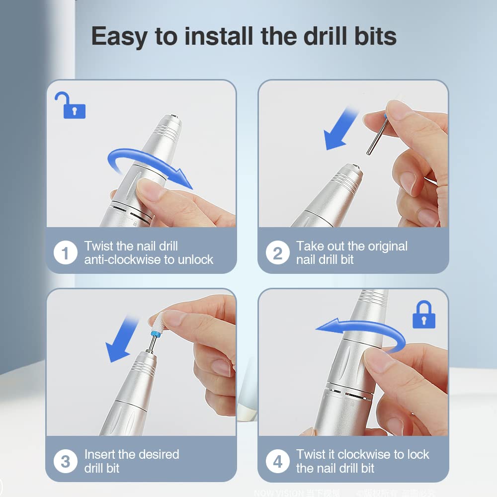 - 【Kabelloses & Tragbares Design】Dank seines kompakten und kabellosen Designs kann dieses wiederaufladbare Nagelbohrer-Set überall verwendet werden, ohne dass ein Kabel stört. Eine ergonomische Stiftform macht es bequemer zu halten und zu greifen, sodass Sie Ihre Nagelkunst überall und jederzeit erledigen können.