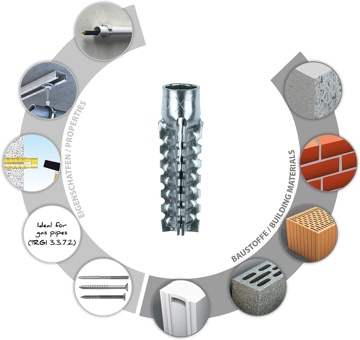 - Der Metalldübel mit seinem 4-fach geteilten Spreizkörper, äusserer Verzahnung und rippenförmiger Innengeometrie erfüllt alle technischen Vorschriften für Gasleitungen (TRGI 3.3.7.2)