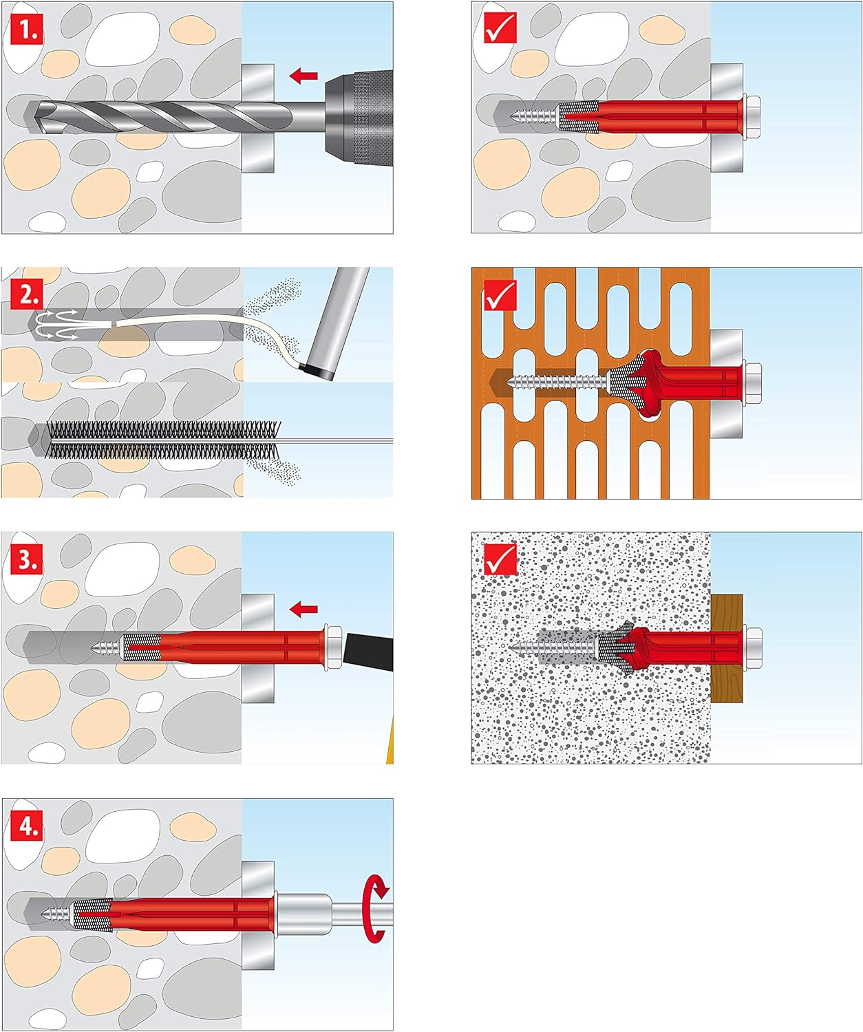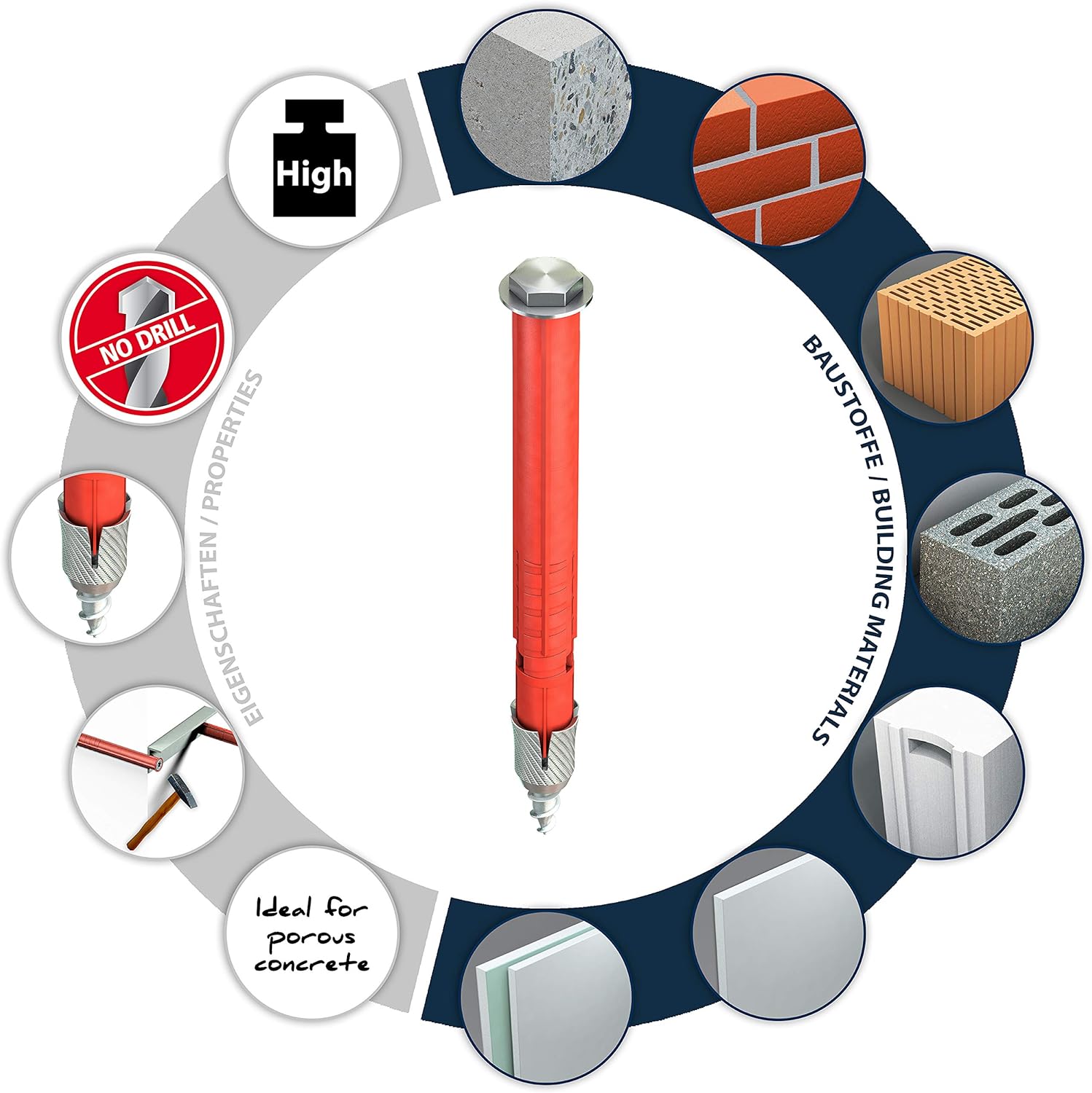 • Dank des 3-fach geteilten Spreizkörpers mit Metallspitze kann der Apollo KB in fast allen Wänden verwendet werden und bietet hohe Haltewerte – je nach Baustoff verknotet oder spreizt er automatisch