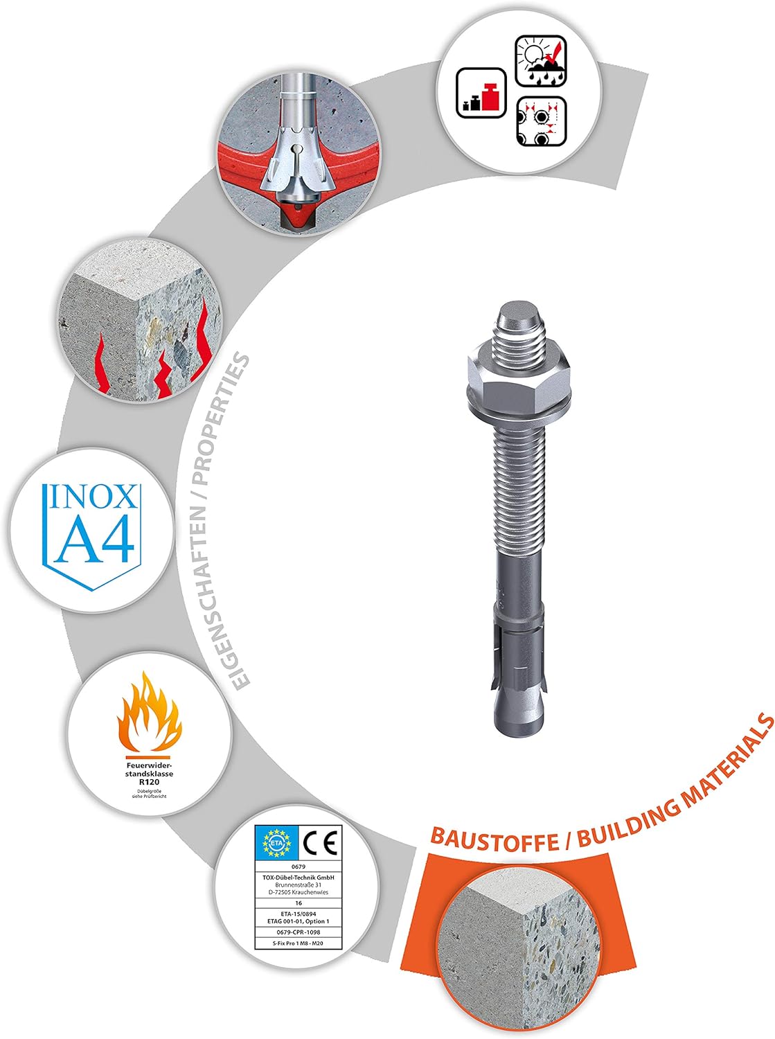 - Lieferumfang: 50x Bolzenanker S-Fix Pro 1 A4 M8x90/25 mit langem Gewinde, Unterlegscheibe und Sechskantmutter, Ausführung in Edelstahl A4, in der handlichen Kartonage, 040171081