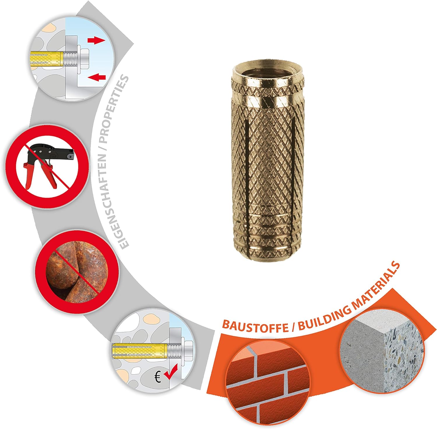 - Der Messingdübel eignet sich in Beton und Vollstein sowohl für die Vorsteck- als auch Durchsteckmontage sowie für alle Schrauben und Gewindestangen mit metrischem Gewinde