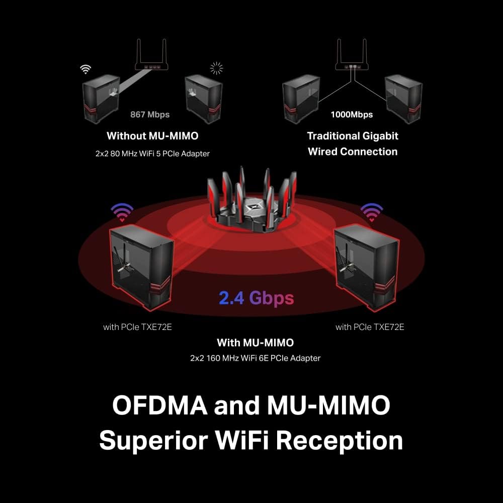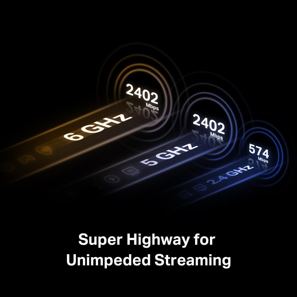 • Unerreichte Tri-Band-Geschwindigkeit - Erhöhen Sie Ihre Gesamtgeschwindigkeit auf bis zu 2402 Mbit/s (6 GHz) + 2402 Mbit/s (5 GHz) + 574 Mbit/s (2,4 GHz)