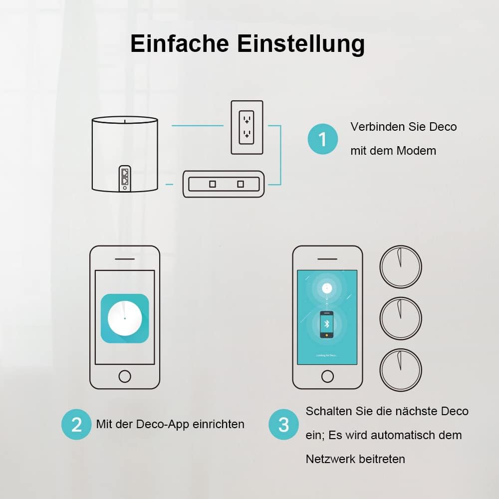 - Einfache und intelligente Installation: Verbinden Sie ein Deco mit dem Modem, laden Sie die Deco-App herunter und starten Sie sie. Folgen Sie den Anweisungen in der App, um die Einrichtung abzuschliessen. Für das nächste Deko schalten Sie es einfach