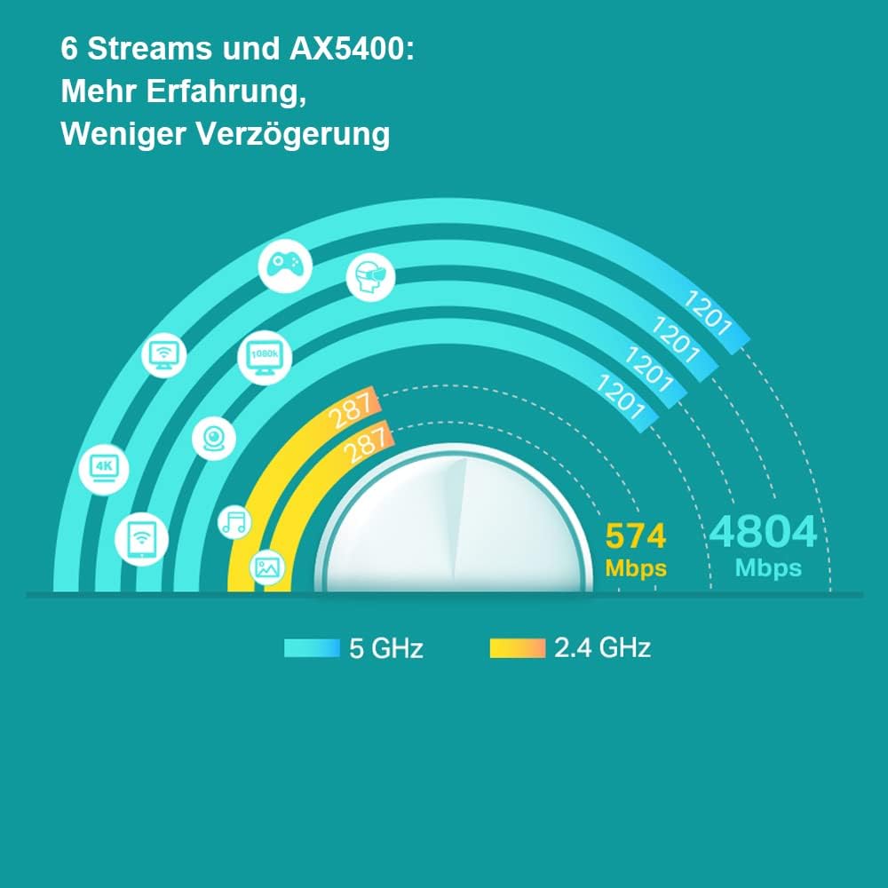 - High Speed und weniger Verzögerung mit Wi-Fi 6: Deco X60 bietet eine sehr schnelle und stabile Verbindung mit einer Geschwindigkeit von bis zu 5400 Mbps, 4804 Mbps zu 5GHz und 574 Mbps zu 2.4GHz. Wi-Fi 6 ermöglicht die Verbindung von mehr als 150